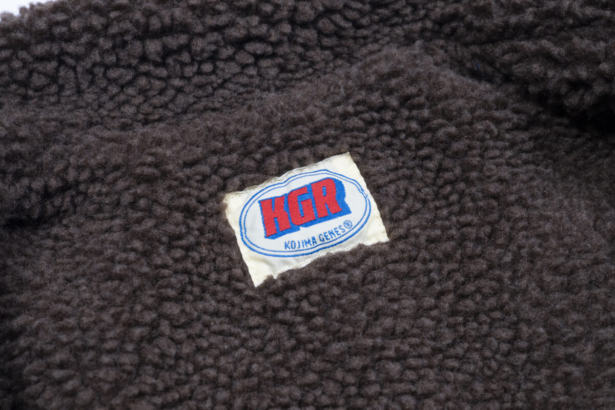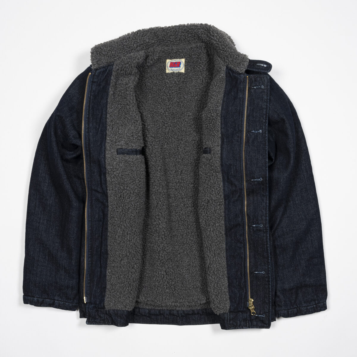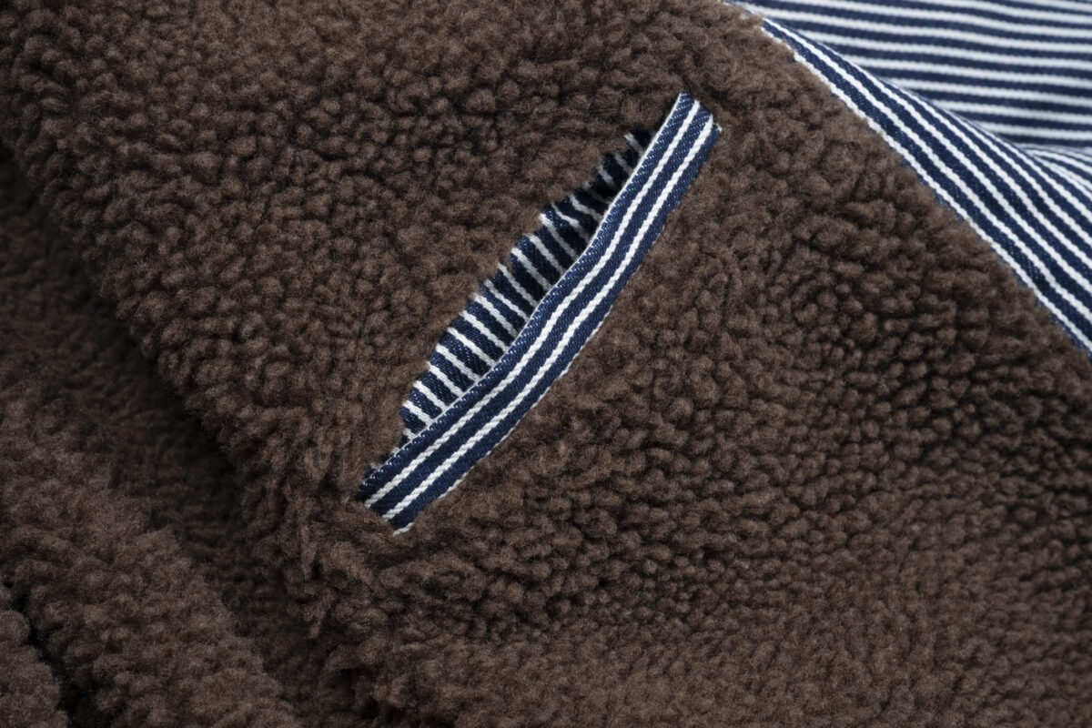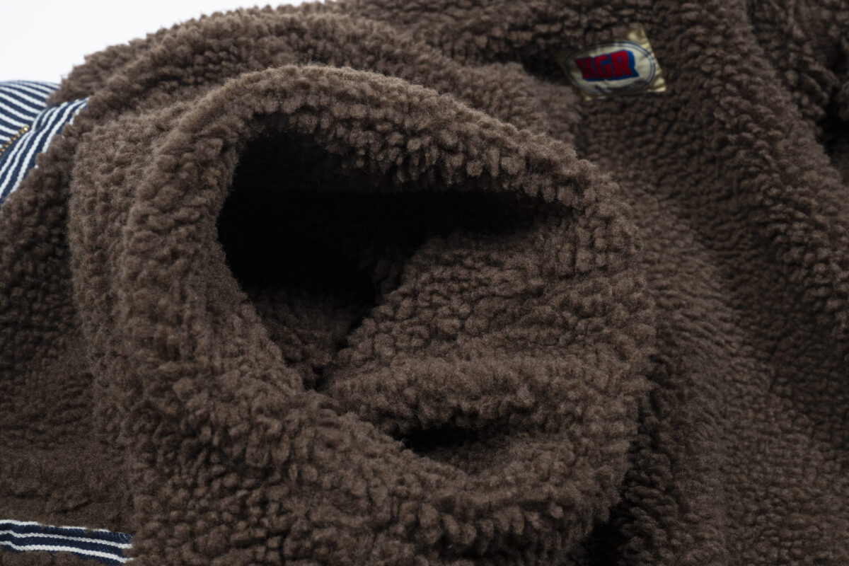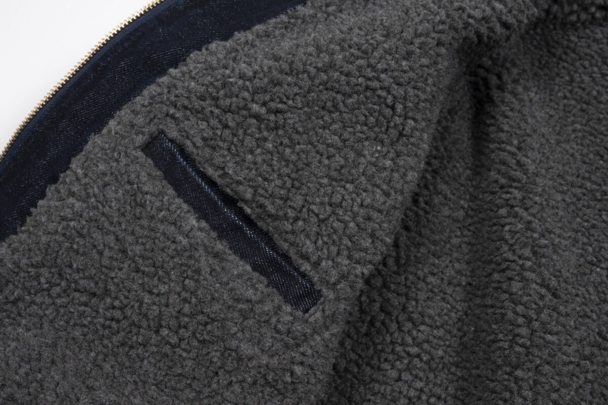 内側のボアはブラウンで、インディゴとはカラーを変えています。襟元までしっかりボアを配置しているので、首元の防寒性もしっかり確保しています。