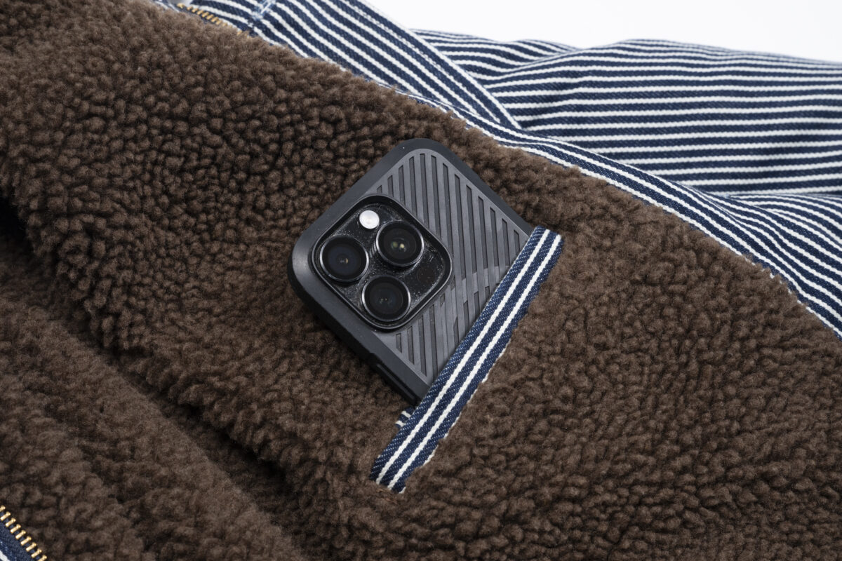 裏地の左右の胸には大型のポケットを装備しています。どちらもスマートフォンがすっぽり入る大きさです。(写真はiPhone 16 Pro)