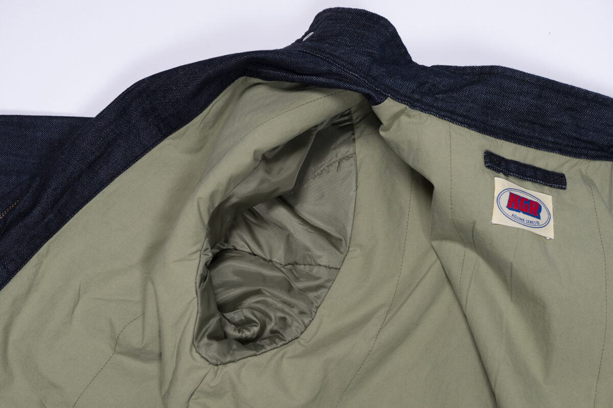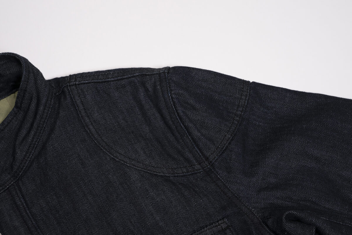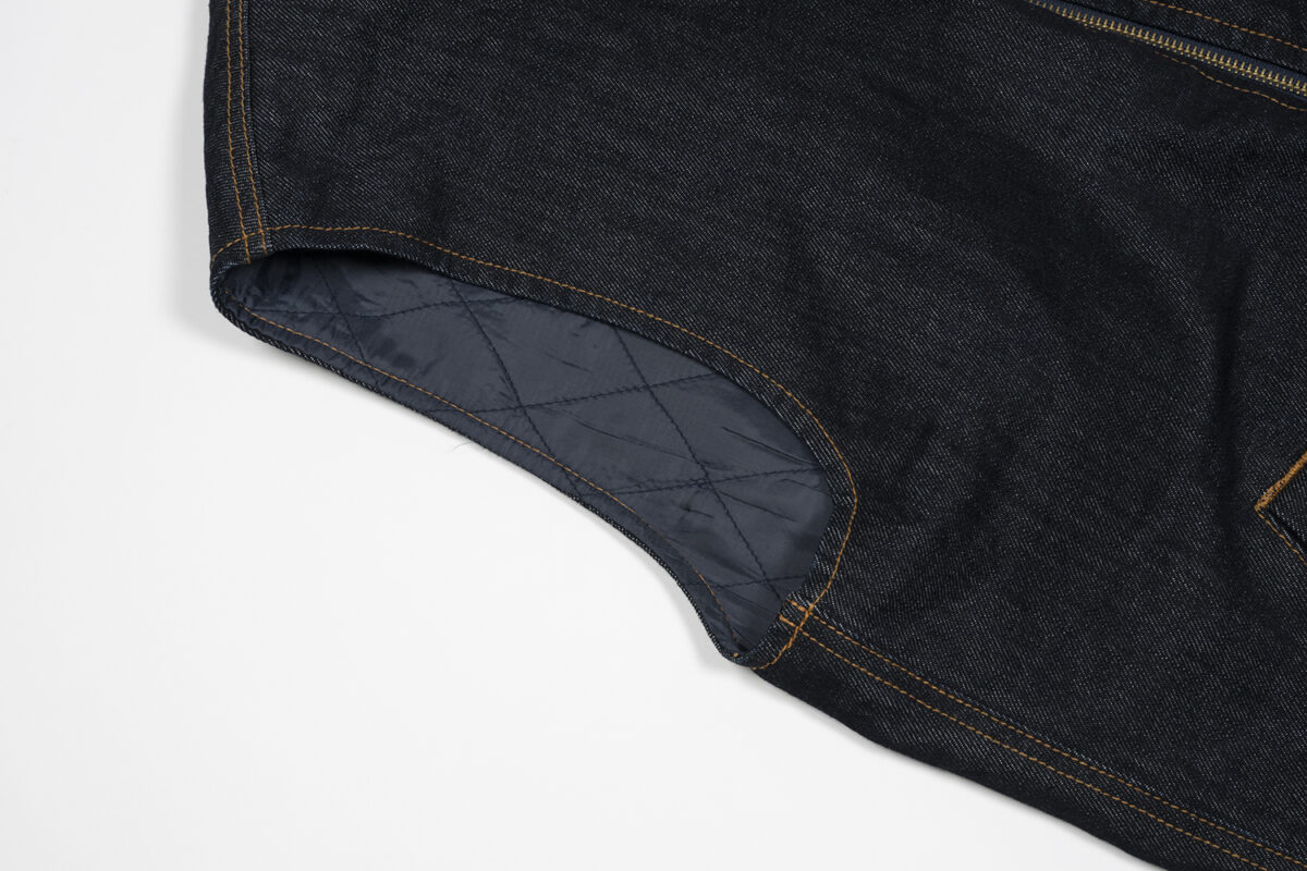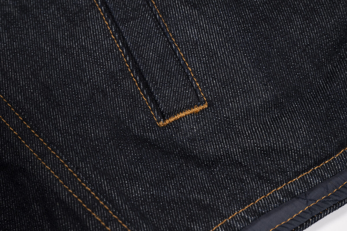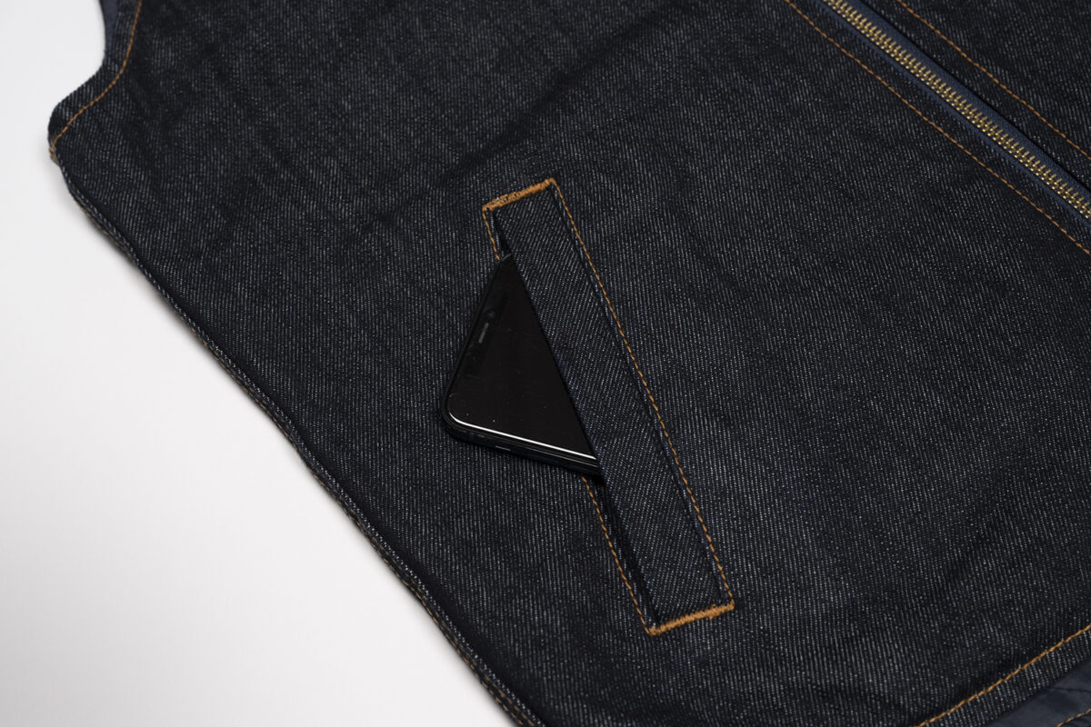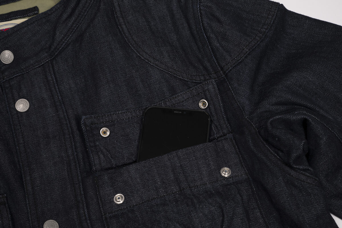 デニム地の方にはスマートフォンもらくらく収納できるポケットが付属。各部のステッチは、タフなデニムウエアをリリースしてきた児島ジーンズならではの丁寧な作り。インナー側にも大型ポケットをひとつ装備しています。
