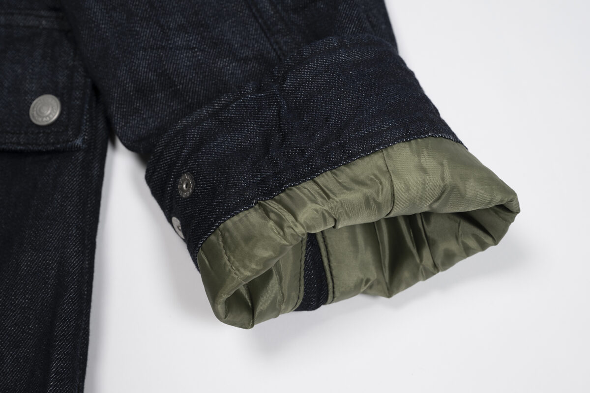 両腕は袖口ぎりぎりまでインナーを配置。冬用のロンググローブを重ねて袖口からの走行風の侵入を防ぎさえすれば、手元は快適です。もちろん、袖口は児島ジーンズのオリジナルボタンで2段階の調整が可能です。