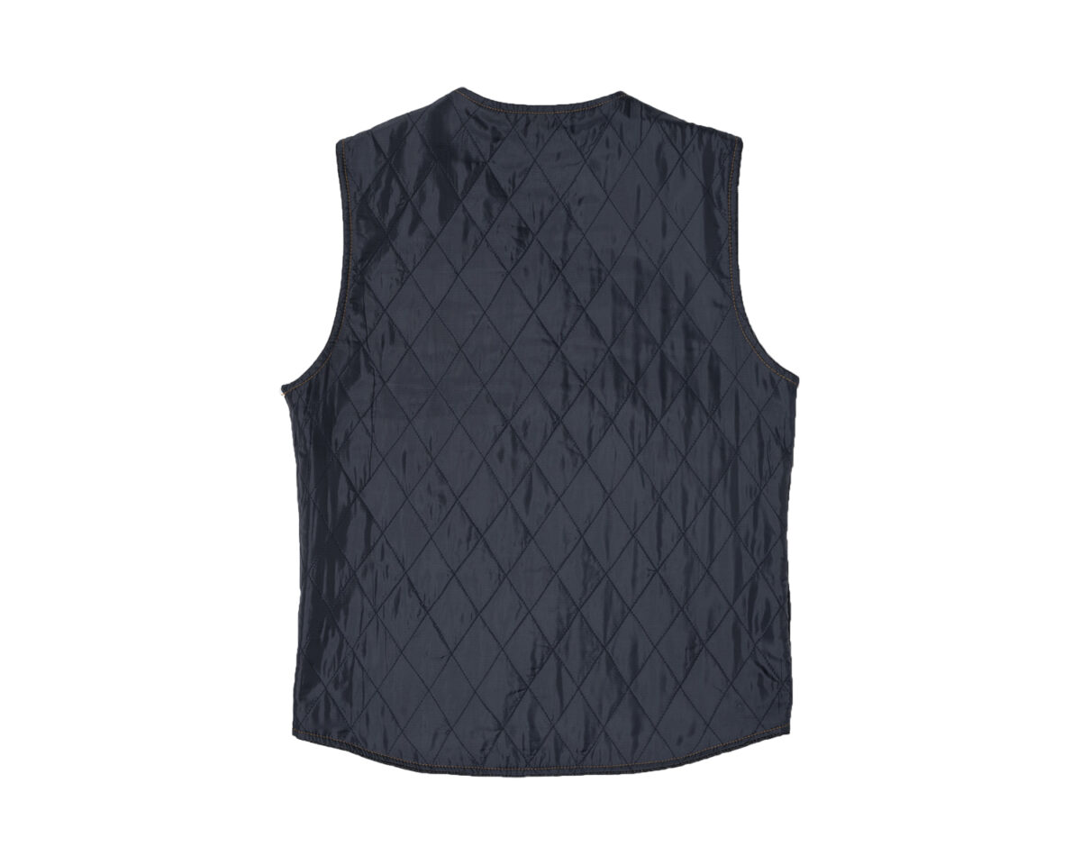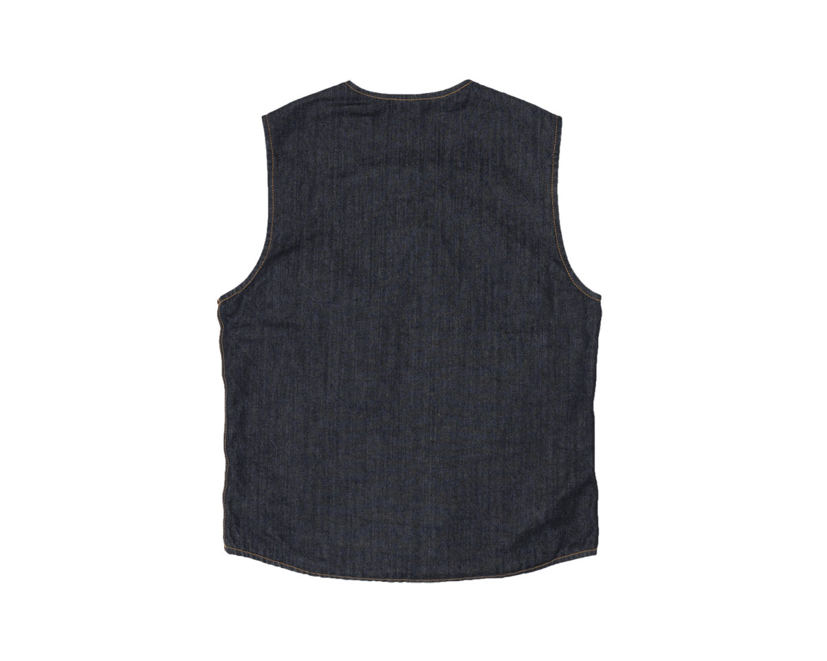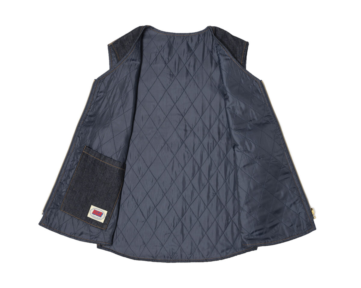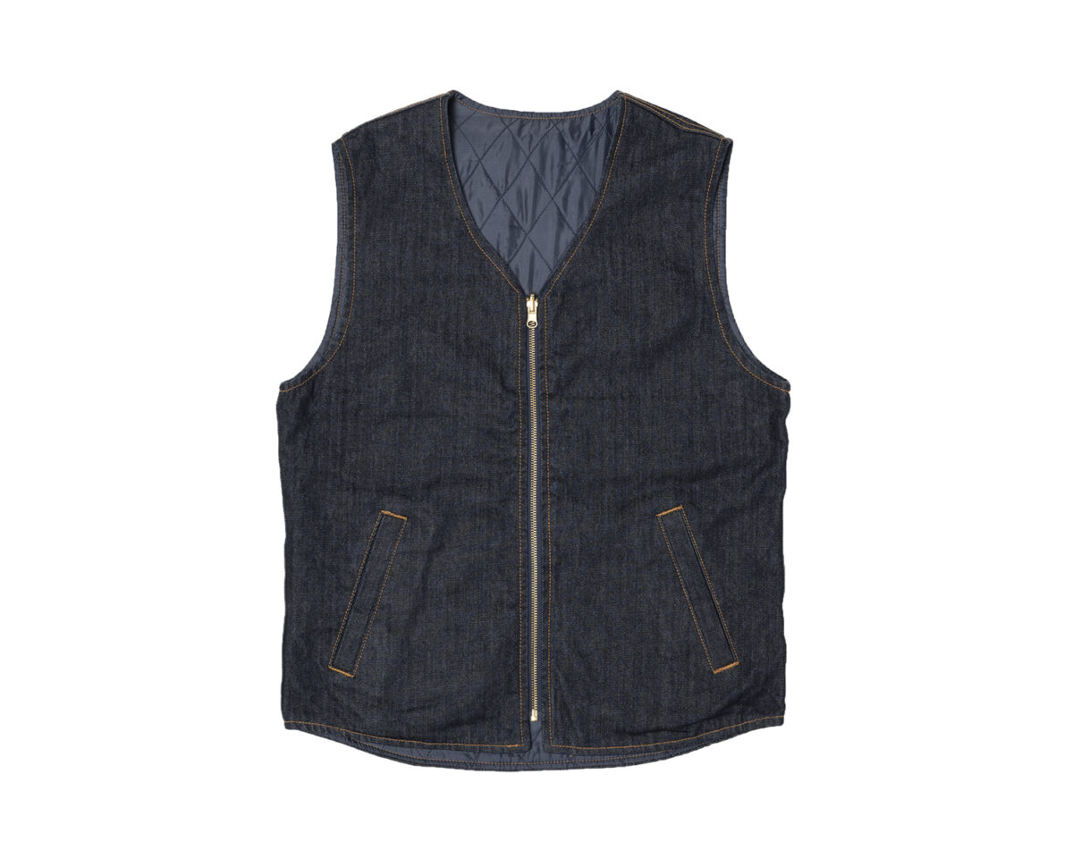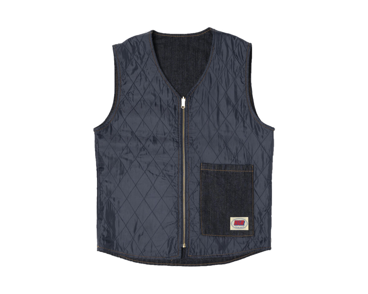 もうひとつご紹介したいアイテムがこちらのエアロゲル・リバーシブル・ベストです。表地にデニム、内側にキルティング、その間にエアロゲルを吹きつけた中綿を採用した高機能ベストです。