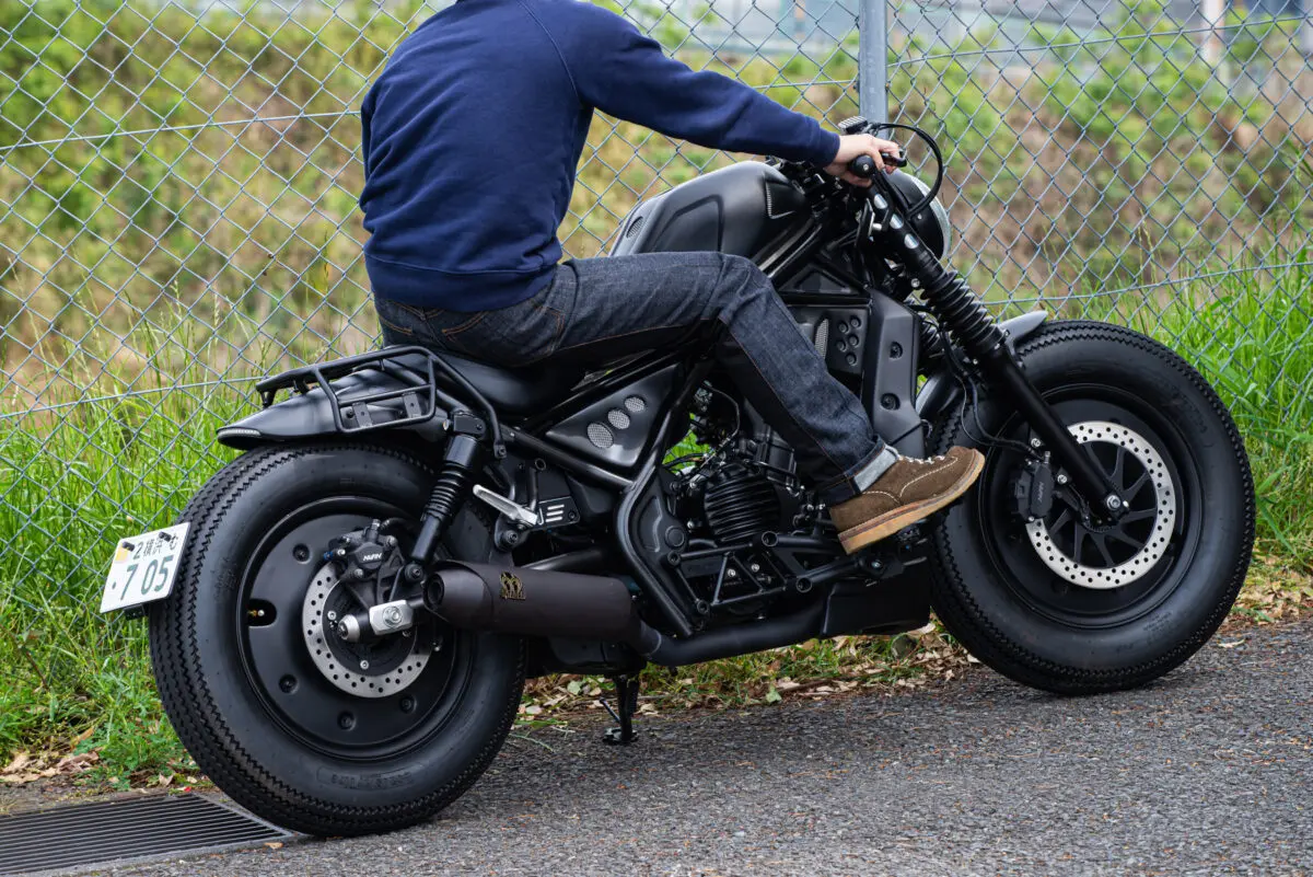 今回スペースモンキーコンボパンツをテストするに当たって用意したのはホンダ・レブル250です。しかもただのレブル250ではなく、K-Speed製のコンプリートモデル! K-Speed製のフルキットを装着したレブルは、ステップが純正位置よりも15cm以上も前方に配置されたフォワードコントロール仕様。つまり膝から足首はエンジンの真横にくるライディングポジションです。