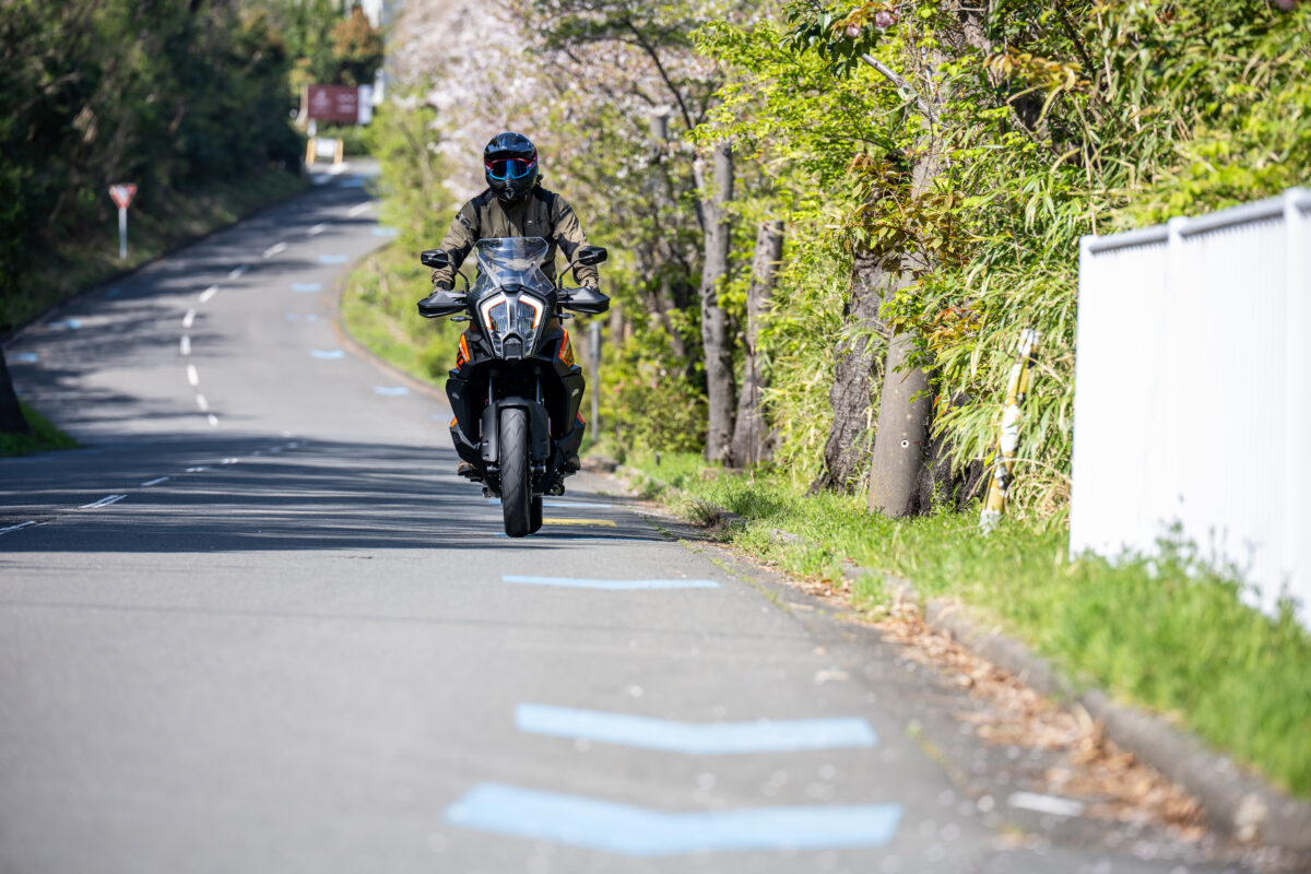 オプションのクイックシフターのおかげでクラッチ操作をせずにシフトチェンジできるので、発進直後からその恩恵を受ける。最大トルク138Nm/6,500rpmを発揮するエンジンは、低速から中速域までとにかく「分厚い」。どこから開けても、ライドバイワイヤーによるアクセルは、ダイレクトでリニアに加速し、車体が即座に反応する。大排気量のアドベンチャーであるにもかかわらず、軽やかなピックアップ感はさすがKTMといったところ。
