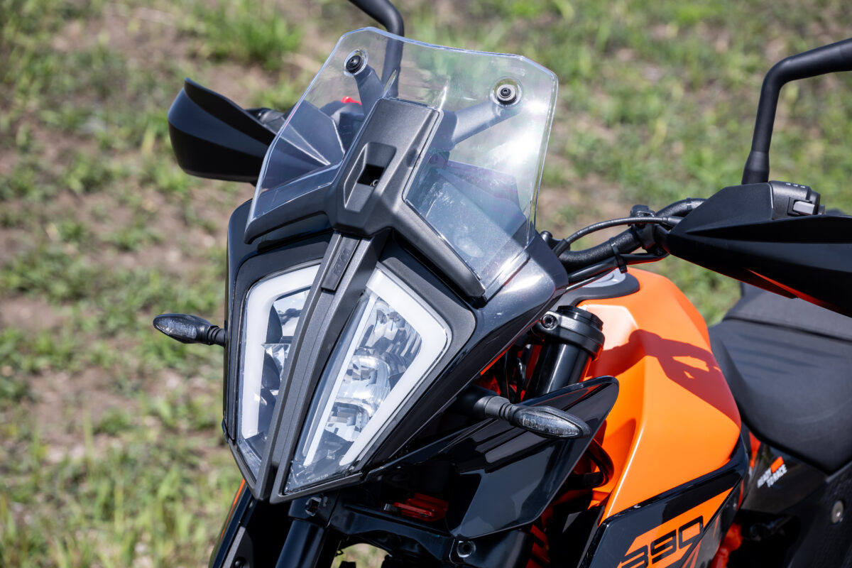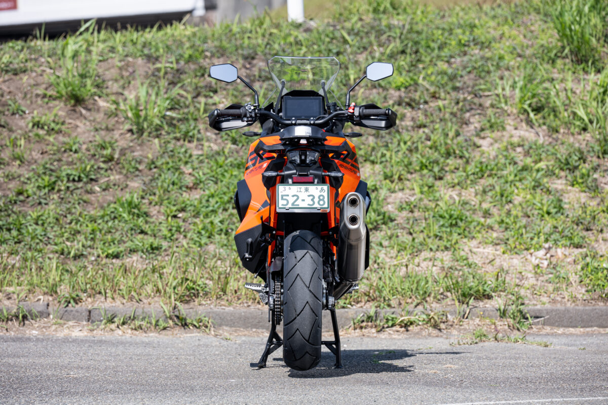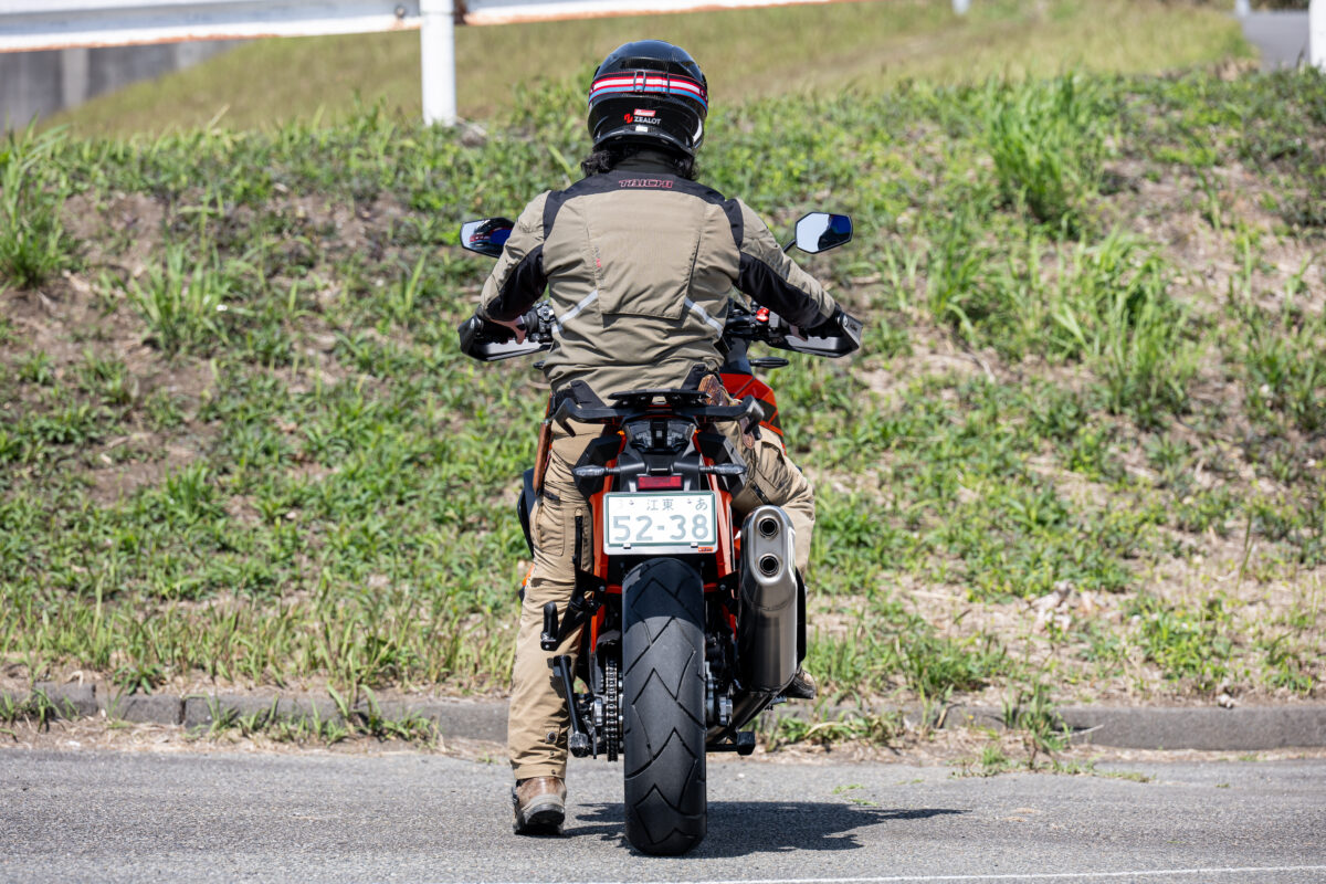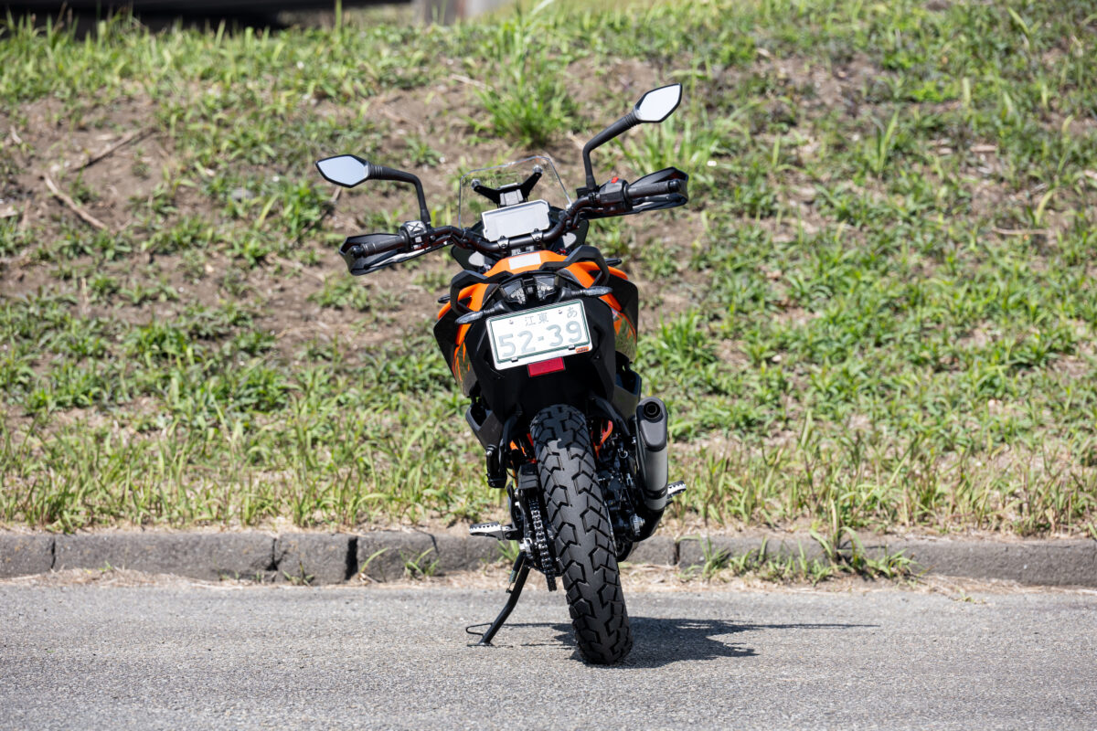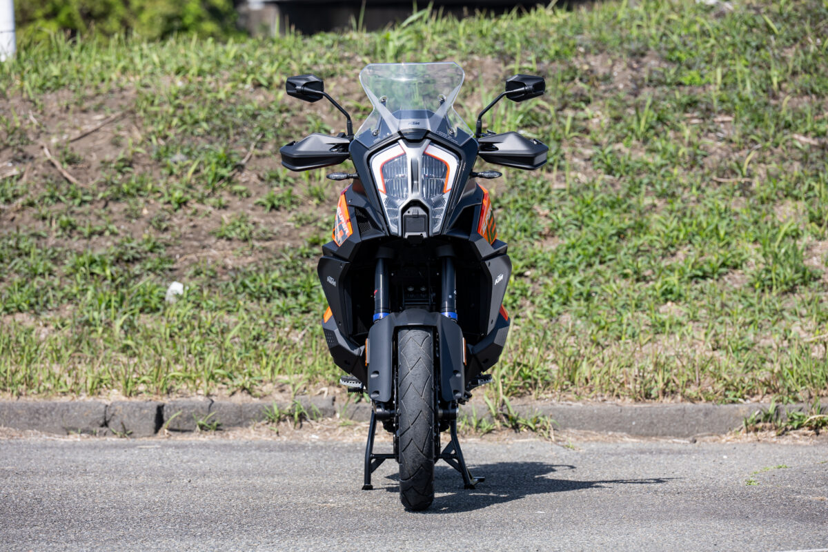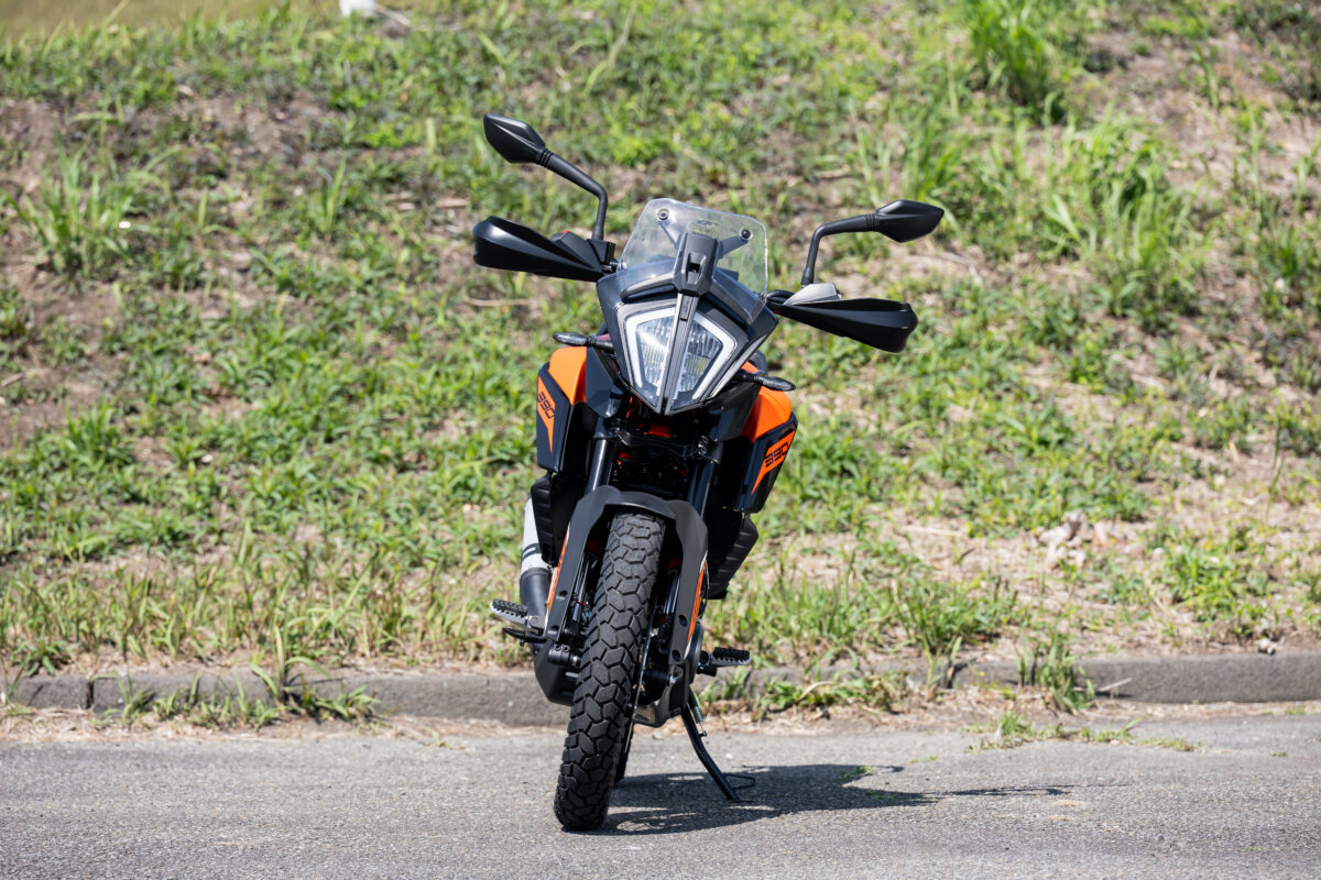 乗る前に実際に押し引きしてみると、当たり前のことながら軽い。前述の1290と比べればそれは当然のことだが、ここでもKTMの車体構成のバランスの良さが浮き出る。大き目のカウルとヘッドライトを装備し、890や1290に準じたKTMらしいシャープな顔つきで、遠方からでも一目でKTMであることがわかる。