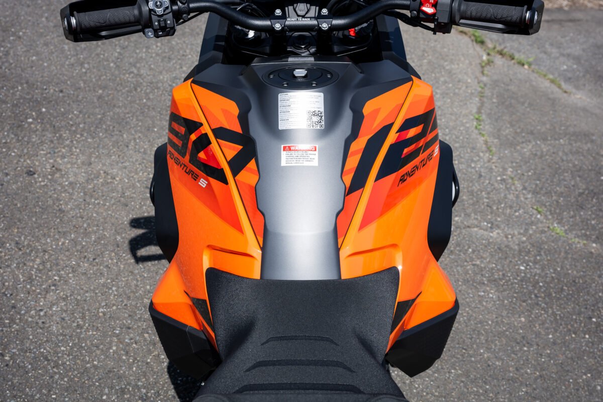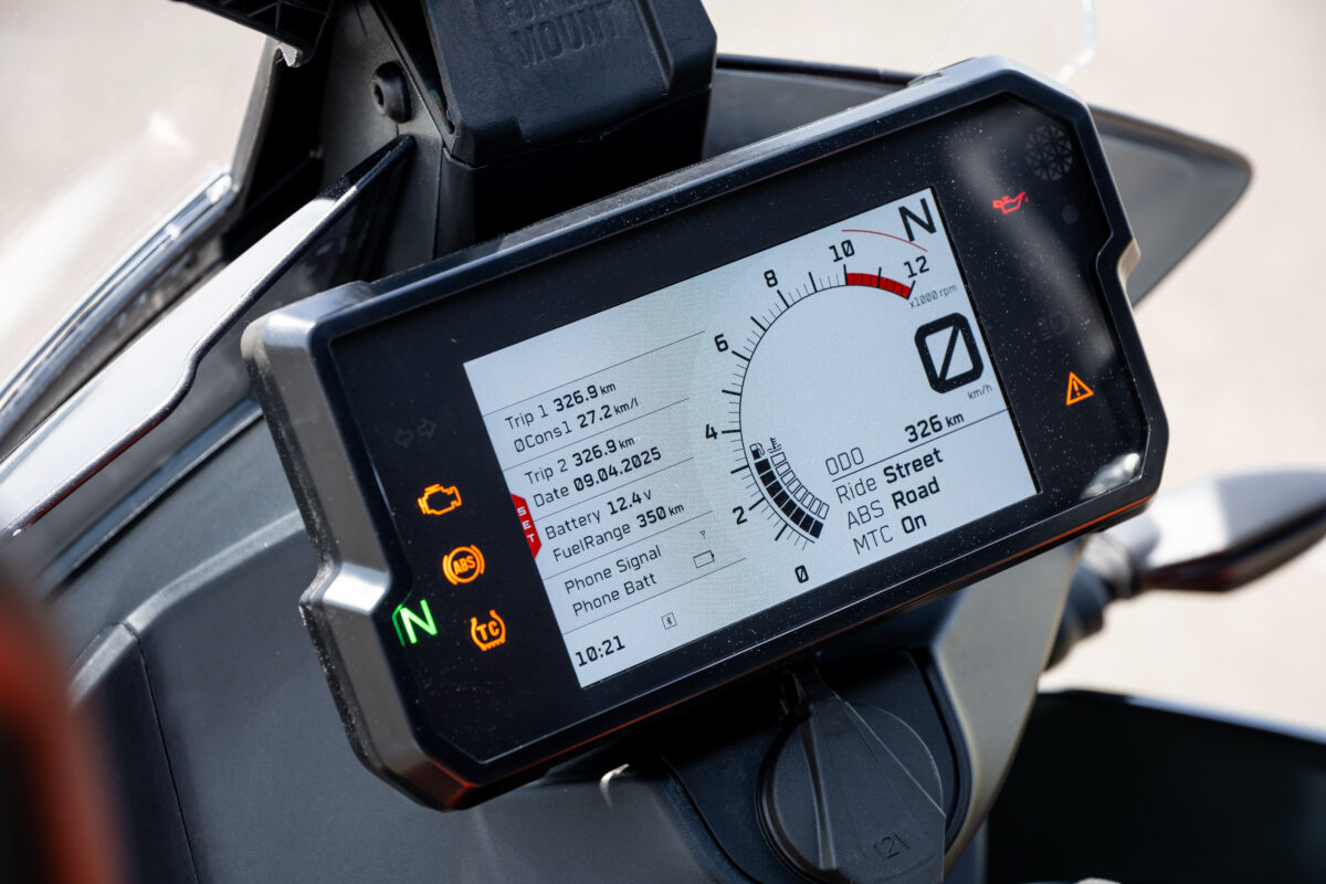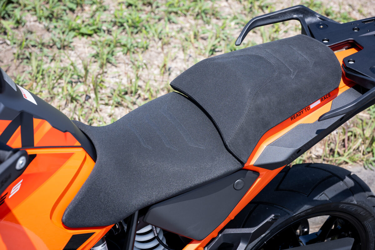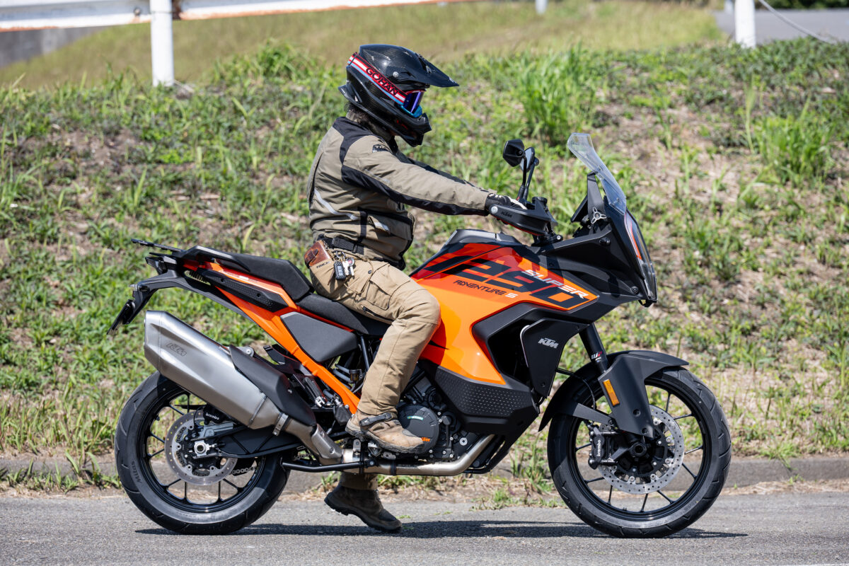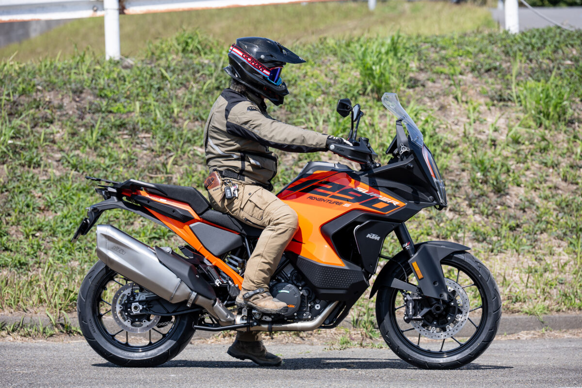 バイクにまたがりキーをオンにしてエンジンを掛けるとKTMのV型ツインならではの迫力のある排気音が響く。身長168cmではたしかに足つきは良くないが、シートのセット位置でハイ側の869mmをロー側849mmまで下げることがきる。またこのモデルはセミアクティブサスペンションという電子制御サスペンションを装備しているので、TFT液晶内で11段階ものプリロードセッティングが可能。さらにサスペンション設定をソフトな“コンフォート”に変更することで、筆者でも片足が余裕で着くようになった。