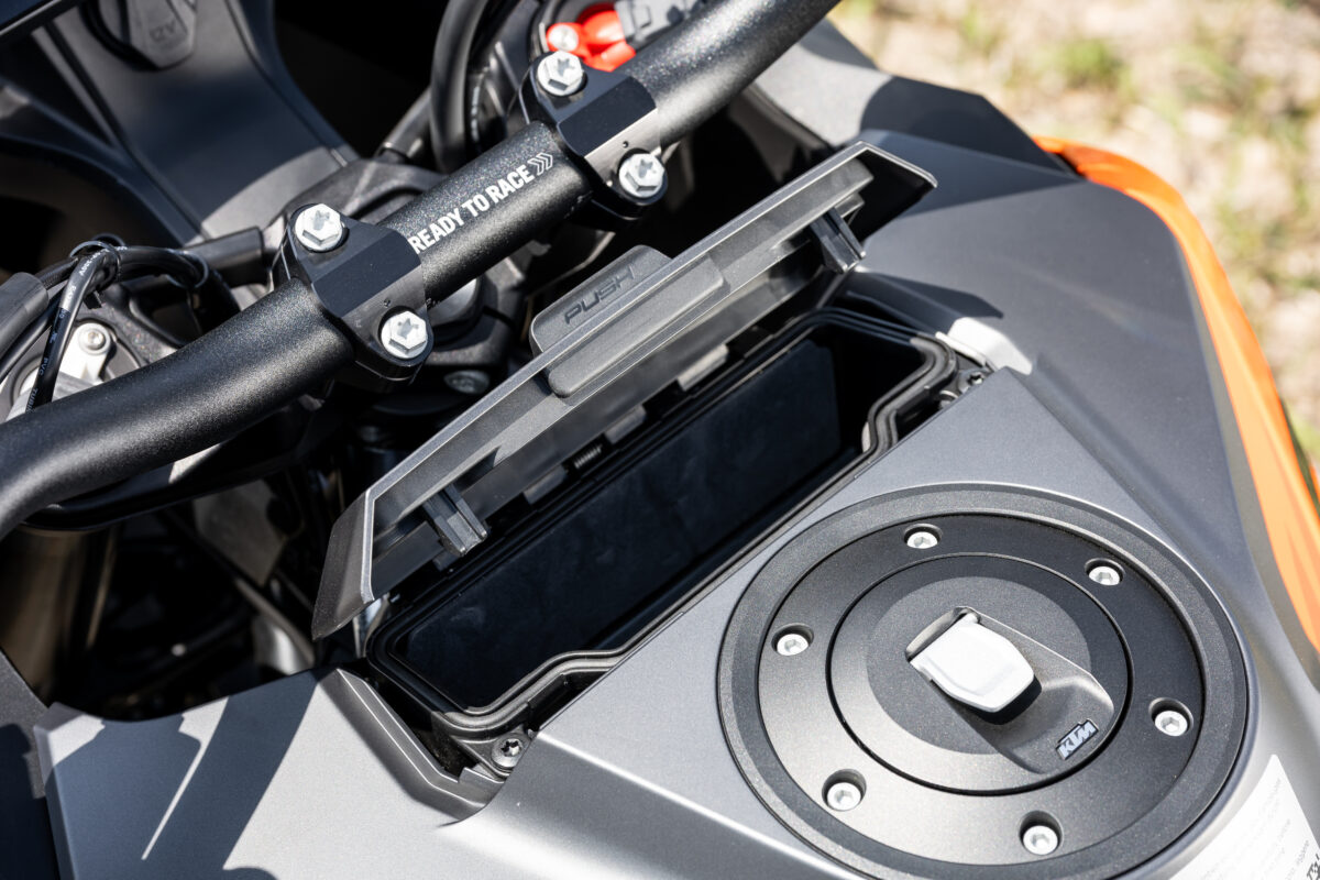 ACCを始め、このKTM 1290 SUPER ADVENTURE Sには、ライダーをサポートするトラクションコントロール(MTC)、アンチブレーキロックシステムはもちろん標準装備。ライドモードは「ストリート」「スポーツ」「レイン」「オフロード」の他、オプションでトラクションコントロールレベルやスロットルレスポンスが変更できる「ラリー」の設定もある。前述のセミアクティブサスペンション、自動で空気圧をモニターするTPMS、USBソケット付きスマホポケットなど、まさに快適な旅を可能にする「全部盛り」の装備を持っている。