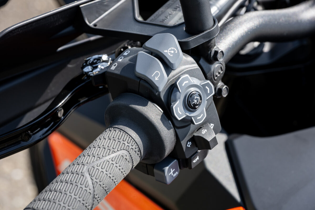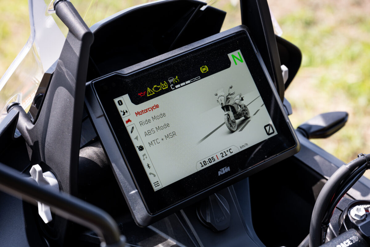 電子制御機能:コーナリングABS、オフロードABS、アダプティブクルーズコントロール、KTMスマートコネクト、MTCモーターサイクルトラクションコントロール、7インチTFT液晶メーター、ARAアンチリレーアタック、