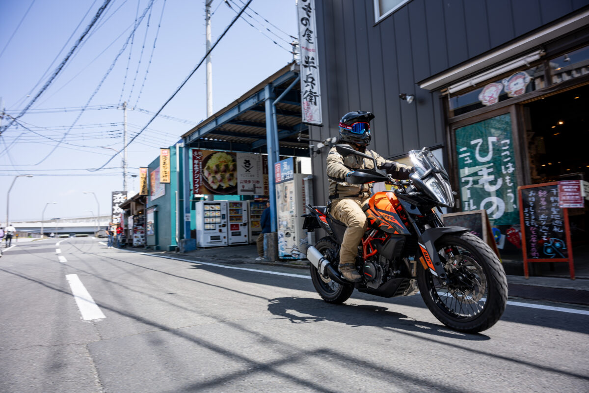 バイクにまたがりエンジンを掛けてギアをミートすると、ストトトと小気味良く回転が上がりながら車体が進む。街中でのKTM 390 ADVENTURE SWの動きは、とにかく軽快だ。シート高は855mmと決して低くはないが、スリムな形状なので、足つきはそこまで悪くない。オフロード走行も想定した170㎜以上のサスペンショントラベルを持つが、舗装路ではWP製APEXサスペンションならではの、かちっとした乗り味も好印象だ。