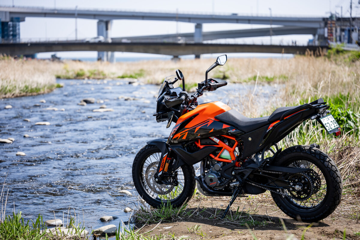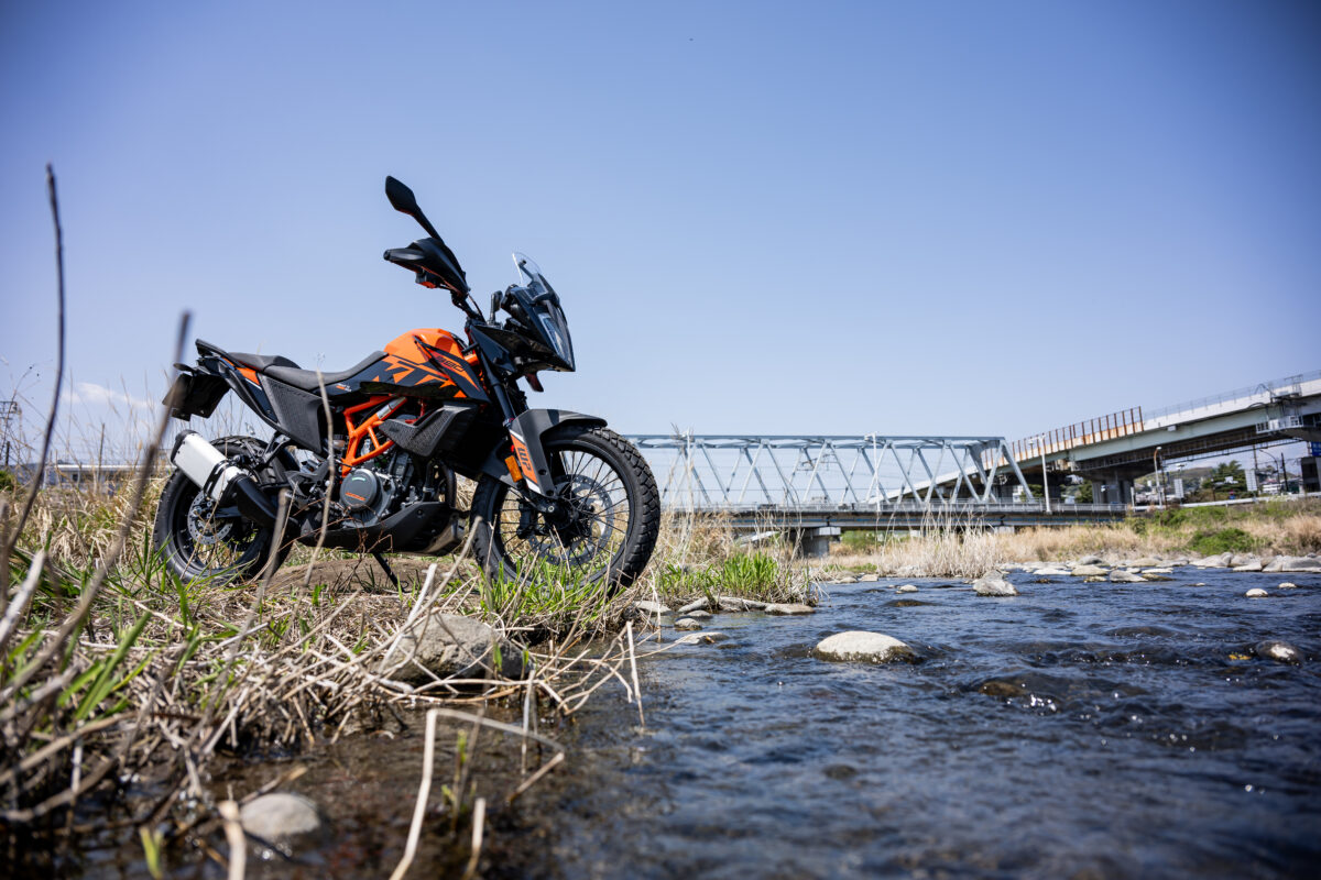 大型のアドベンチャーモデルではUターンに苦労しそうな河原でもKTM 390 ADVENTURE SWならひょいっと転回できるので、ちょっと冒険してみようかな、という気持ちになる。旅先ではこれがとても大切。