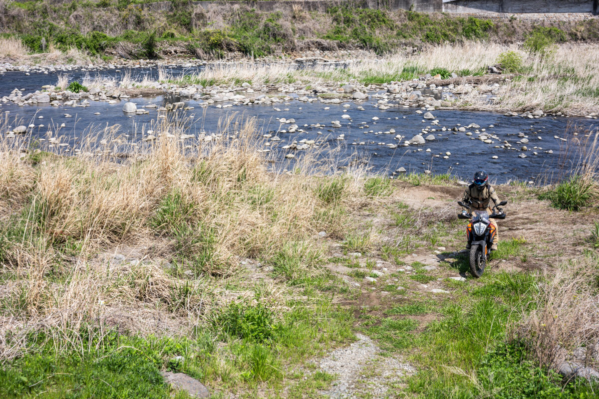 今回はほんのわずかだが、河原へ降りてそのオフロード性能の片鱗を味わうこともできた。その河原は基本が砂地で、隠れたボーリング玉大の岩も多い場所なので、1290などの大型アドベンチャーでは少し躊躇うような場所だが、このKTM 390 ADVENTURE SWなら、あまり臆することなく川面付近まで降りられた。ここでも車両重量(燃料除く)161kgという車体の軽さとロングストロークサスペンション、粘る低速域のおかげだ。