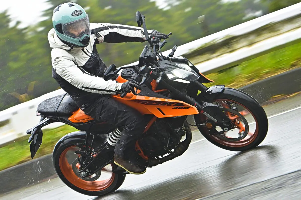 KTM 390 DUKEもウェット路面での試乗となった。「STREET」と「RAIN」の2つのライドモードを選択することができ、まずはデフォルト設定となるSTREETモードを試してみた。