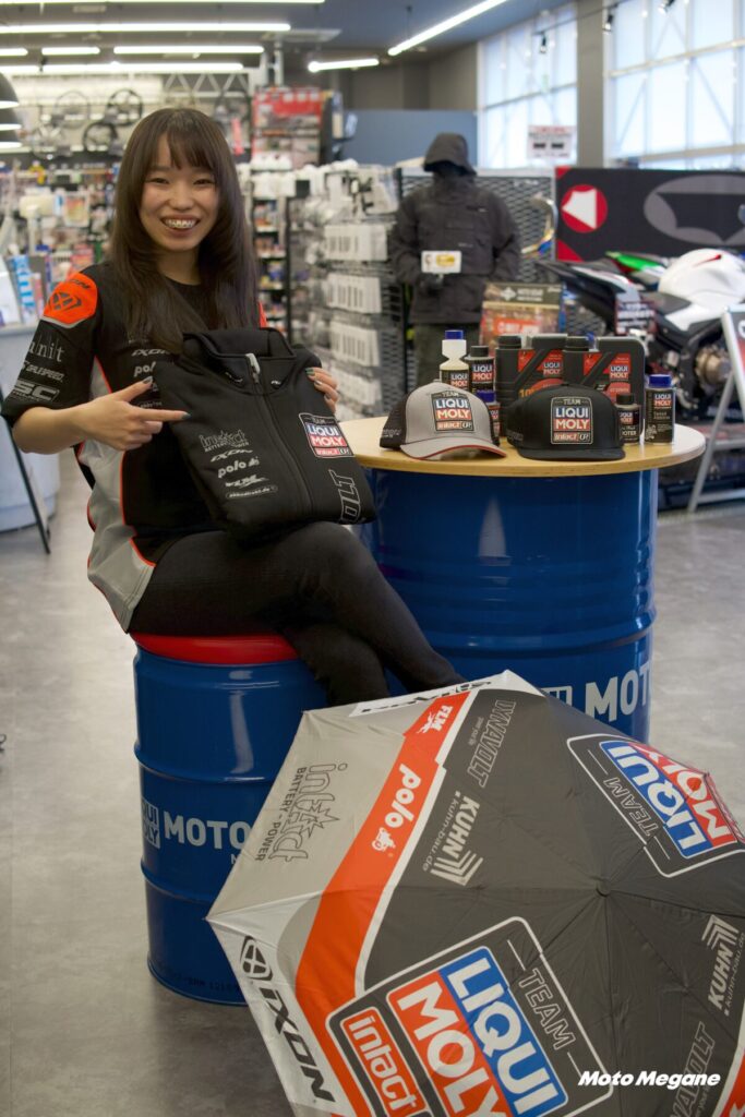 バイクに関するギアとLIQUI MOLYのフルラインナップが遊び心ある店内に並ぶ