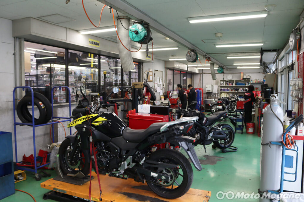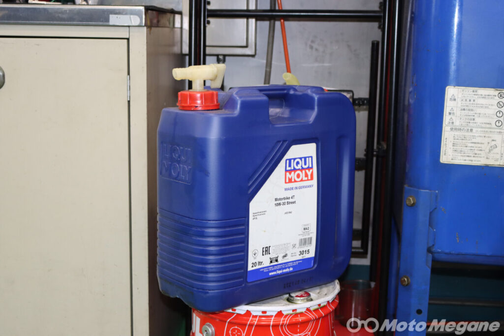 メンテナンスを行うピットには、量り売りにすぐ対応できるようにLIQUI MOLYオイルのストリート用10W-30のオイルボトルが鎮座している。