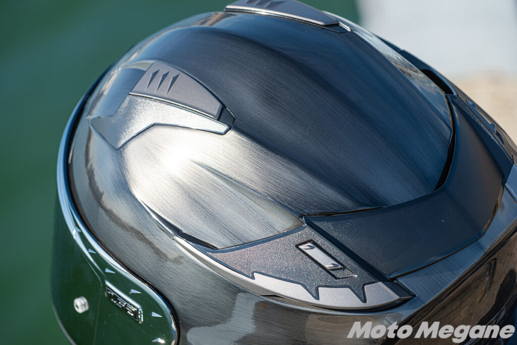 後頭部のエアベントはスポイラー上部に設置していて、こちらもノールックでの操作がしやすいつくり。実際のエアフローも非常に優れていて、テスターのTOMOさんもその快適性に驚いていました。また帽体の両サイドにはエアロパーツを配置しており、高速走行時でも高い整流効果を発揮します。