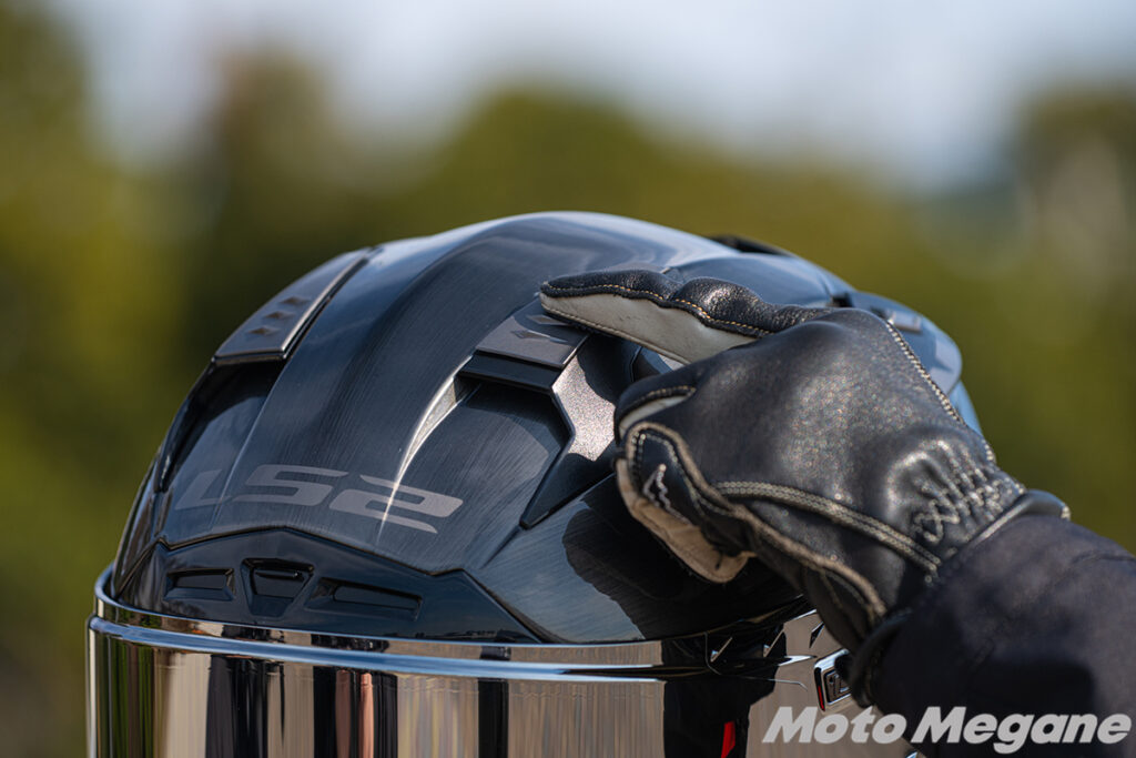 頭頂部と後頭部の左右に設けられたベンチレーションの開閉スライダーも、走行中での開閉がしやすいように大きめ。ミラーなどで確認する必要もなく簡単に開閉できます。
