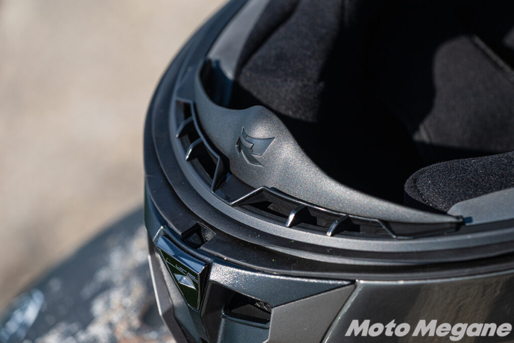 おでこのベンチレーションは全閉と全開の2段階で、中央のノブで開閉します。また、内部にはスポイラーも装備していてシールドの曇りを効果的に防ぐことができます。