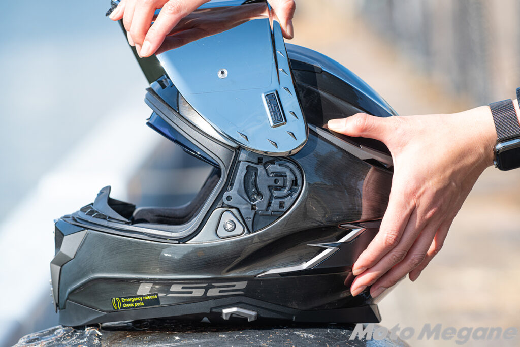 そうするとシールドがいとも簡単に外れます。取り付けの際はシールド開閉部のラチェットの凹凸とシールドの凹凸を合わせてはめこむだけです。筆者もこれまで様々なヘルメットを使用してきましたが、LS2 Challenger Fはその中でもかなり気軽にシールド交換ができるヘルメットだと断言できます。