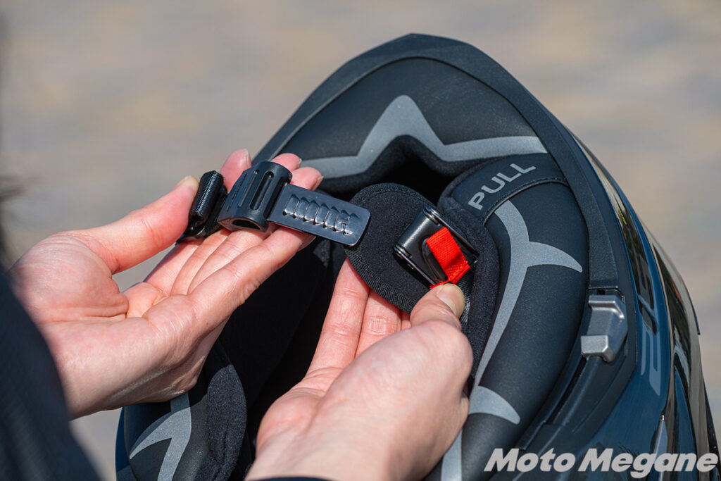 Challenger Fではベルトストラップにワンタッチ装着が可能なラチェットタイプを採用。Dリングタイプよりもヘルメットの脱着がしやすい作りです。