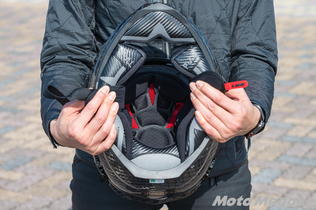 LS2 Challenger Fの内装はテスターのTOMOさんも絶賛するほど快適性に優れたもの。キメの細かいナイロンの内装は肌触りがとても滑らか。長時間の装着でも肌を優しく包み込んでくれます。内装パーツのクッション性もよく、頭頂部からサイドまでストレスのない適度な締め付けが快適な走りをサポートします。