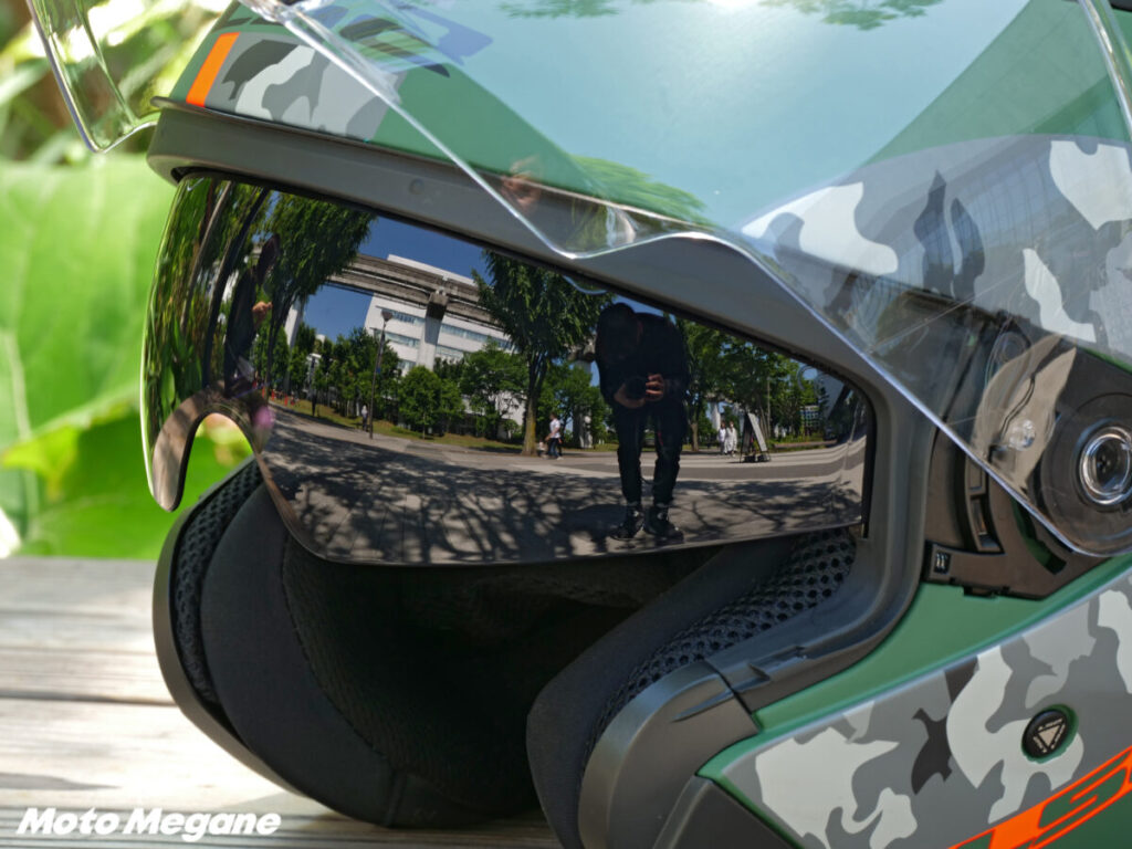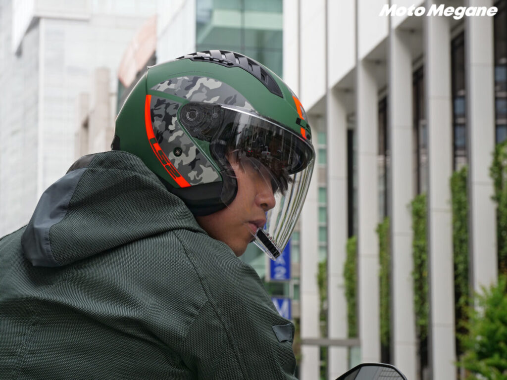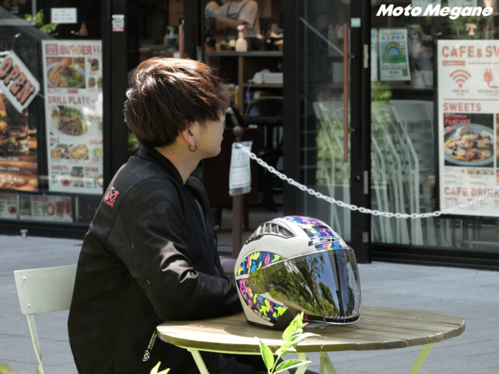 また、どちらのカラーも普段着やバイクウェアとも合わせやすく、身につけているとヘルメット単体で見た時よりも思いの他派手すぎないのがオシャレなポイント。最近は二輪業界だけでなく流行となっているアースカラーやミリタリーカラーでまとめたコーディネートも楽しめ、街中からツーリング先まで主張しすぎずにキラリと光るグラフィックが見た人の目を惹くに違いない。