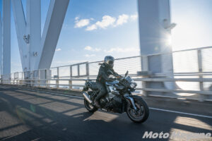 オンロード仕様に模様替えしたエクスプローラーFをかぶって、BMW Rナインティでテストライドをするつぐみさん。こういう車両とのマッチングも良いですね。シート高の高いRナインティですが、つぐみさんは軽い身のこなしでサッと乗りこなしてしまいます。BMWに乗るのは久しぶりです、といいながら危なげなく乗りこなしてしまうライディングセンスはさすがのひとこと!