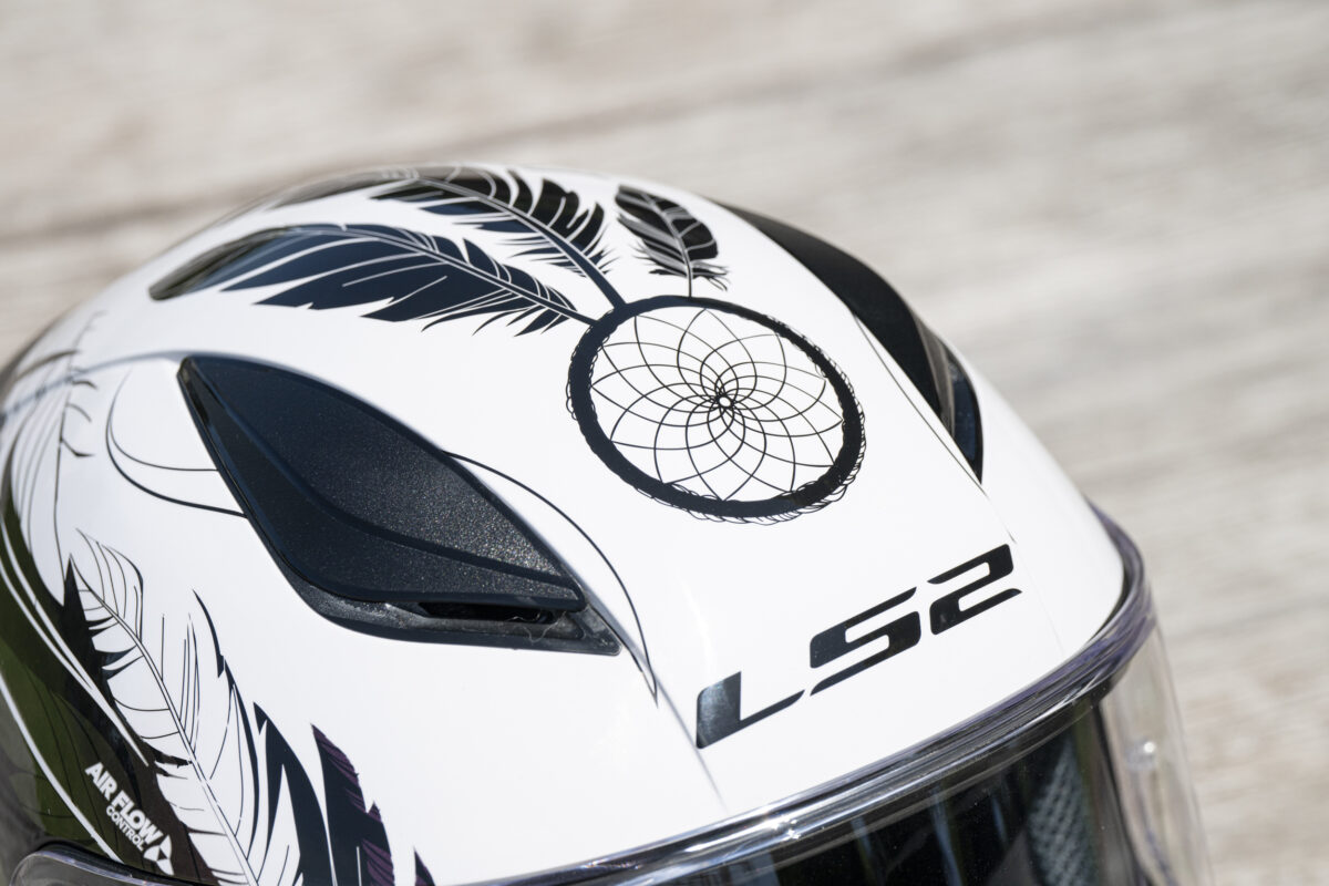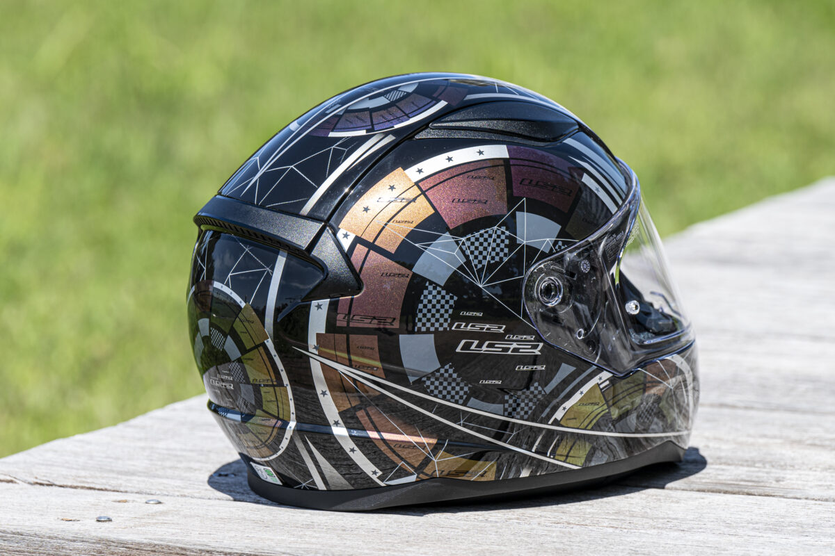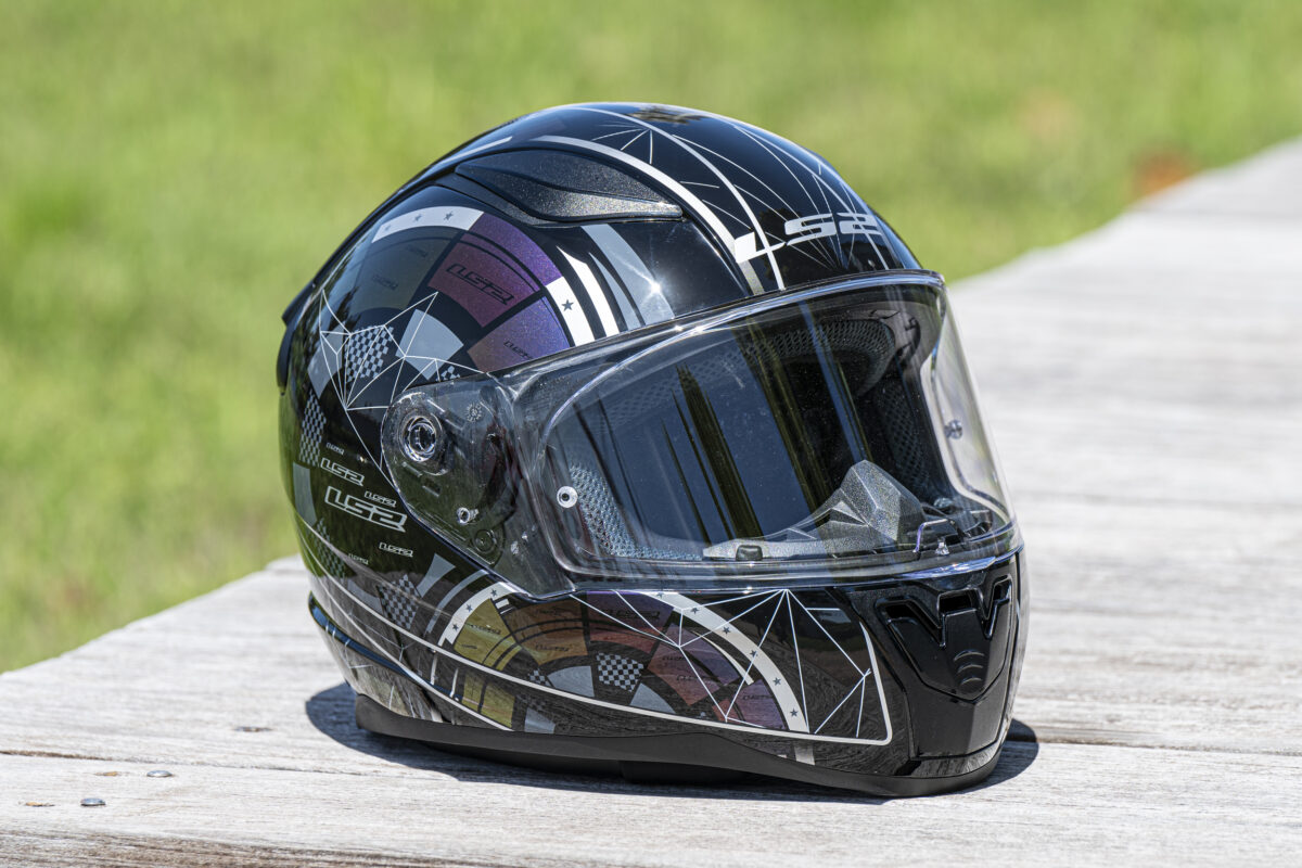 帽体のデザインはとてもシンプルなフルフェイス。LS2らしいスピード感のあるシェイプ、あごや頭頂部に設けられたベンチレーション、そしてシールドのデザインも洗練されています。