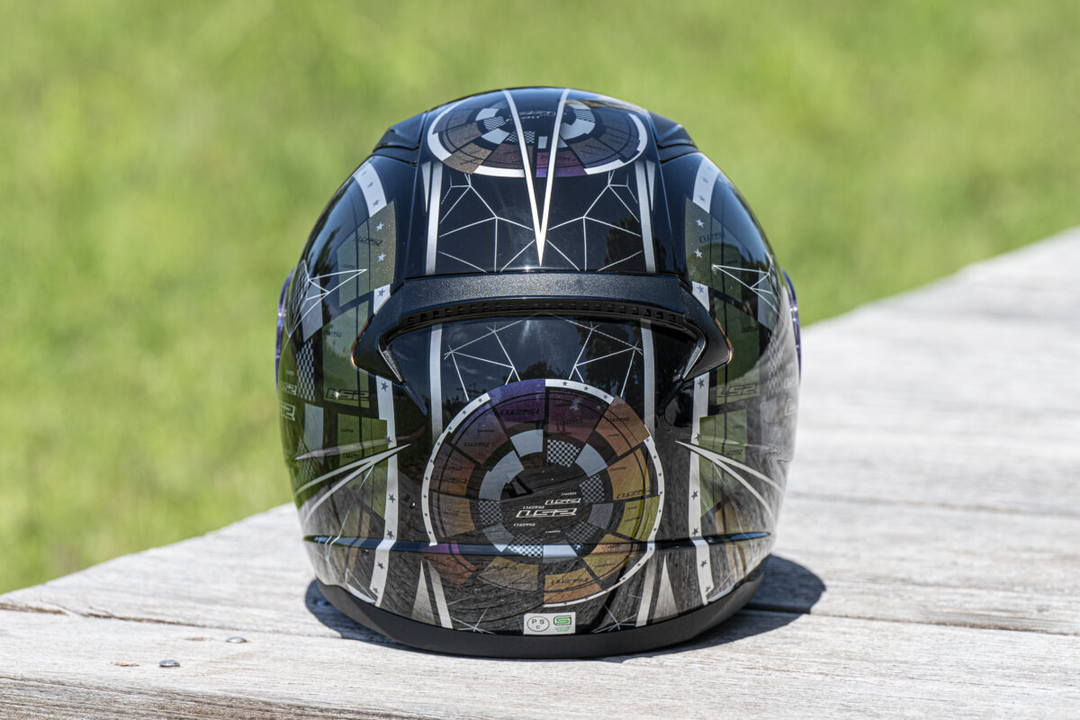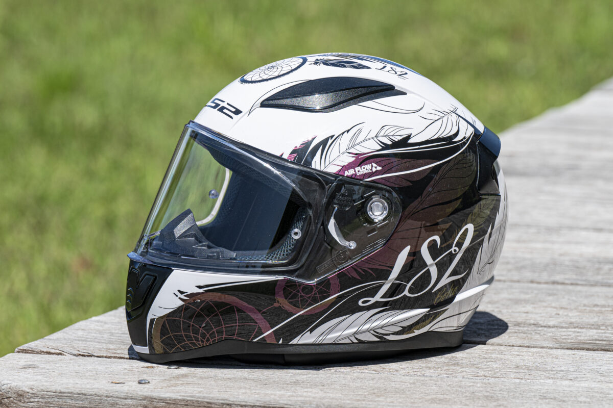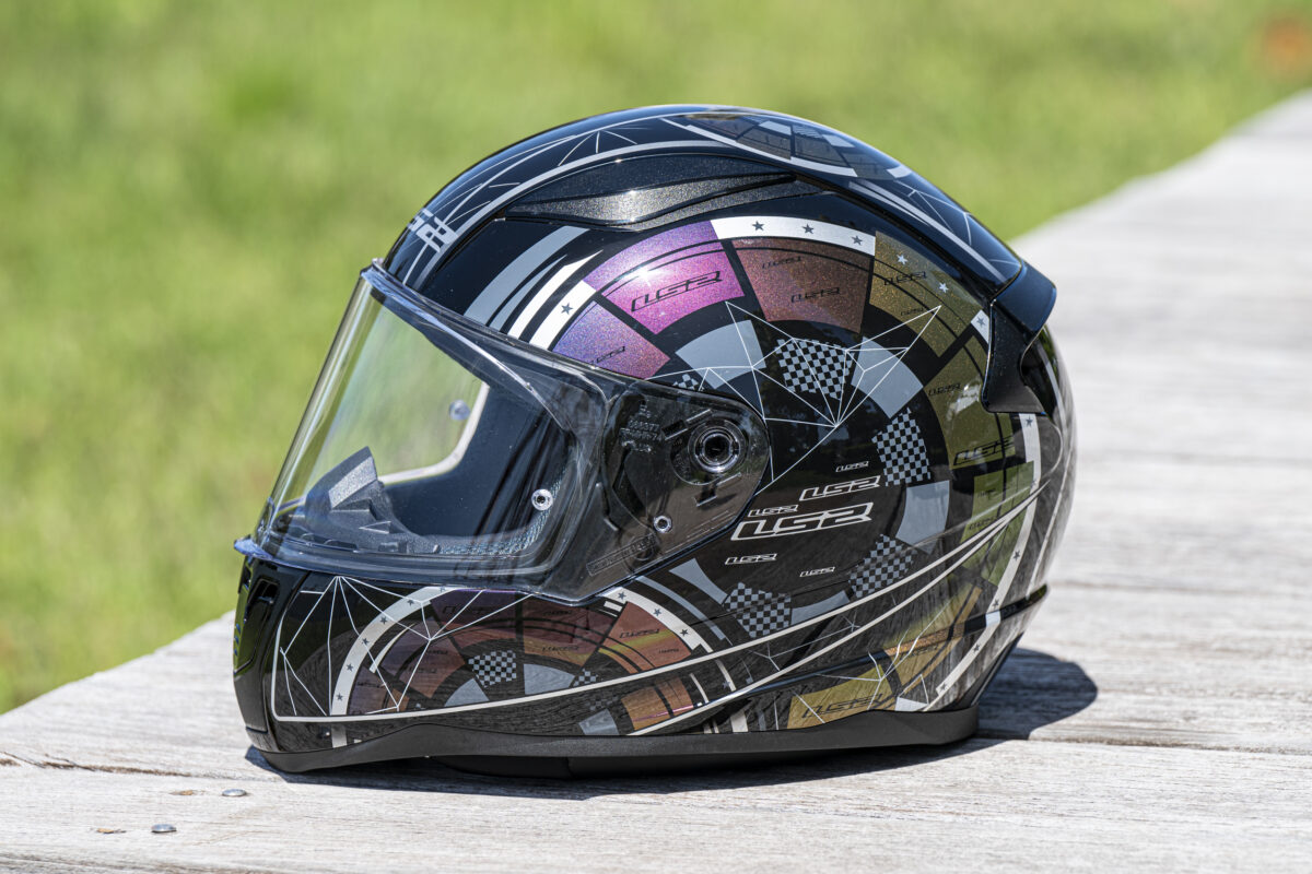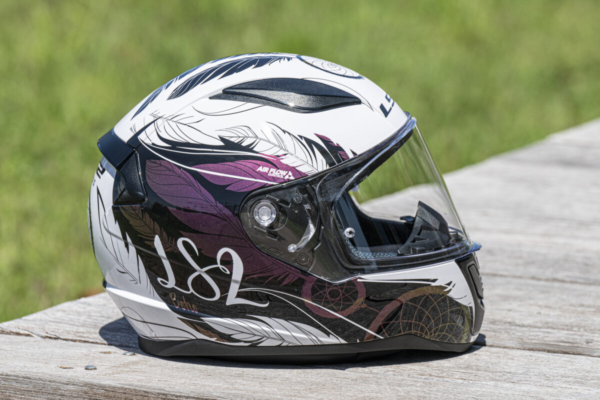 帽体のデザインはとてもシンプルなフルフェイス。LS2らしいスピード感のあるシェイプ、あごや頭頂部に設けられたベンチレーション、そしてシールドのデザインも洗練されています。