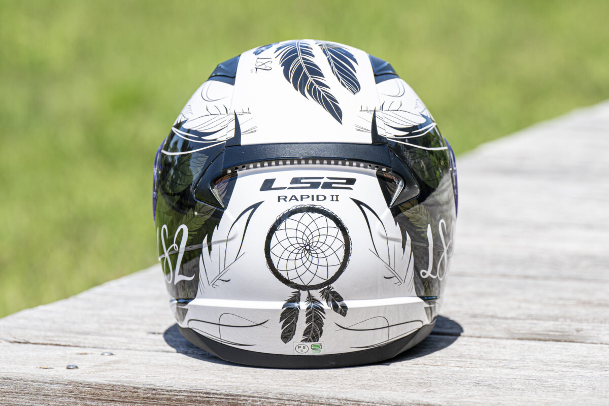 後頭部とおでこには何やらリングのような絵柄とイーグルの羽があしらわれていますね。ところでみなさん、このモチーフをご存知ですか? じつはこのリングと羽の絵柄は、北米の先住民族の間で古くからお守りとして使用されていた「ドリームキャッチャー」がモチーフ。蜘蛛の巣に見立てた網目で悪い夢を捕まえて、良い夢だけをもたらす─そんな魔除けとして重宝されてきたデザインなのです。一瞬の油断で危険な目にも遭ってしまうバイク乗りにとって、お守りは欠かせないもの。RAPID Ⅱのクールなグラフィックにはライダーにぴったりな絵柄なのです。