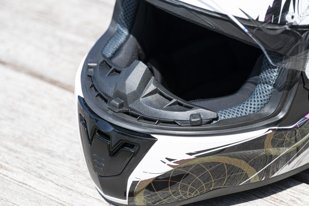 桜井さんも絶賛の内装は肌あたりのよい低刺激性の素材を採用、もちろん取り外しも可能なので、定期的な洗濯もOK。さらにシールドの内側にはスポイラーを装備しており、あごのベンチレーションから入った空気をヘルメット内で整流します。スポイラーは鼻を覆うように伸びた形状で、冬場は吐息でシールドが曇ることを防いでいます。さらに、オプションではピンロックシールドも用意。空気の層を挟むことでシールドの曇りを抑えるピンロックシステムを使用すれば、雨の日や冬場でもストレスなく走行することができます。
