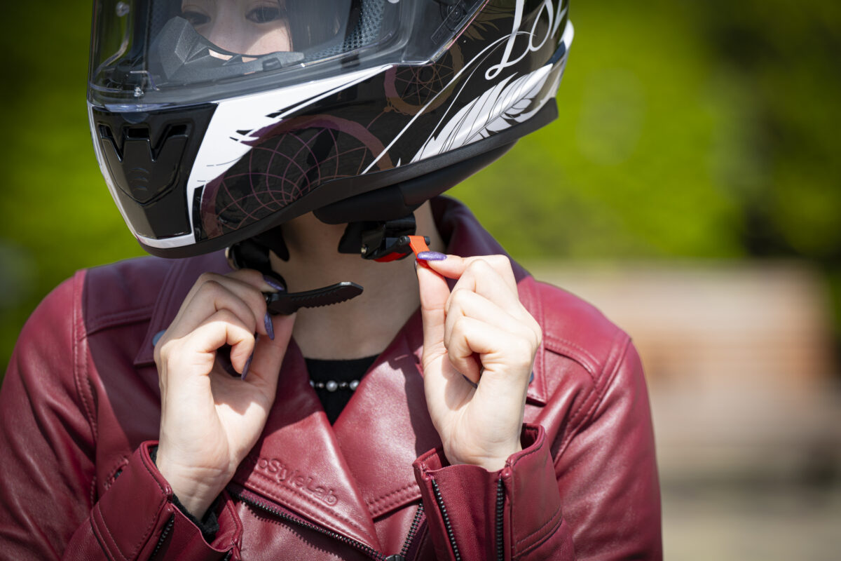 ヘルメットのストラップにはLS2独自のあごひもバックルを採用しています。このバックルはクイックリリース仕様で、赤いプルタブを引きながらストラップを金具に通す/抜くという動作で簡単に着脱が可能です。