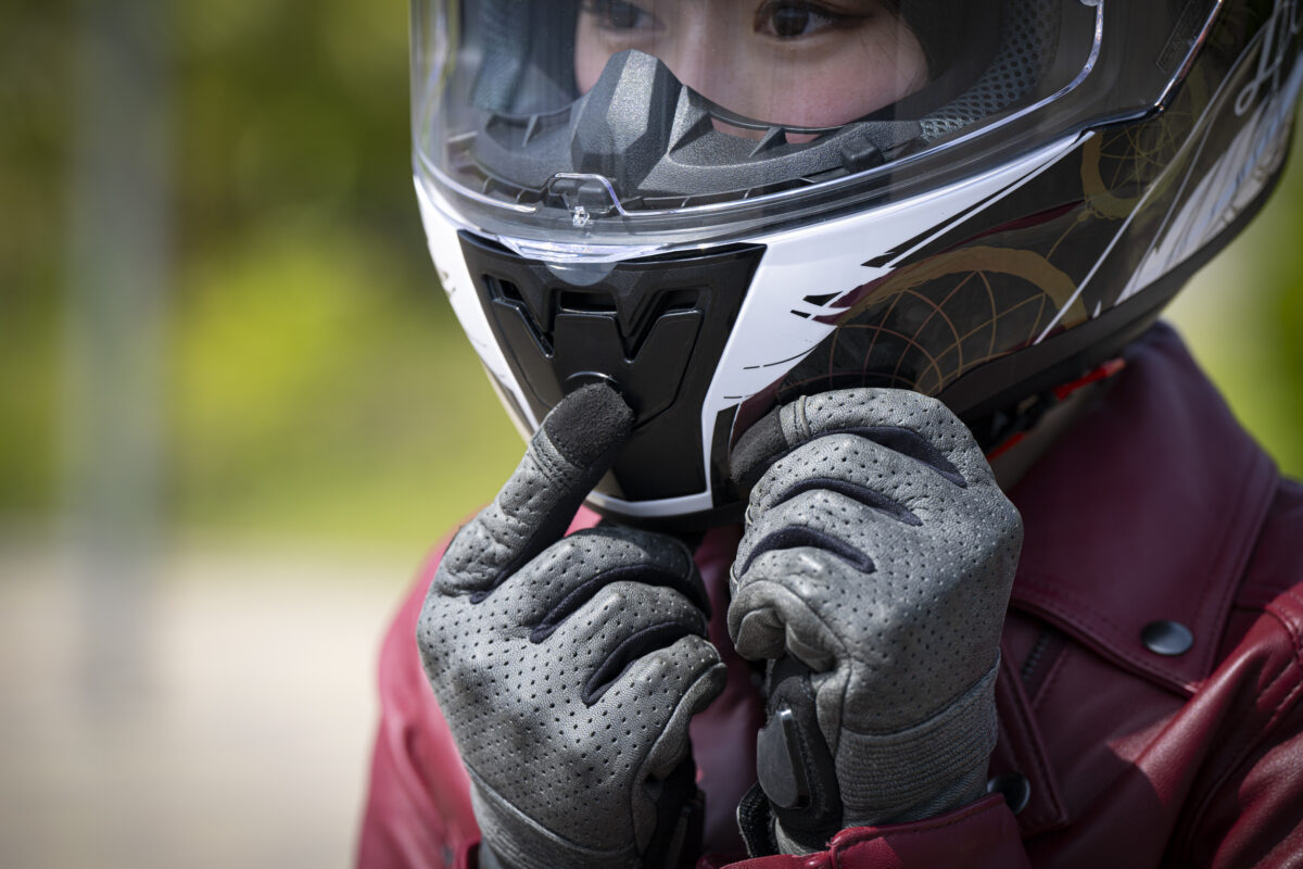 桜井さんも視界の広さやクリアさを評価していたシールド。開閉の際には中央の突起部分をつまんで開け閉めするだけ。片手でシェルを押さえて開けるのが確実ですが、慣れれば片手でも操作できます。また、純正のクリアシールドはこう見えて94%のUVカット仕様! スモークシールドを使わずとも紫外線を効果的にカットできるのです。さらに耐摩耗性を高めているので、擦り傷にも強い。かなり考えられたつくりです。ちなみに、上の写真でシールド上にある小さな丸い突起がピンロックシートを取り付けるためのボスです。