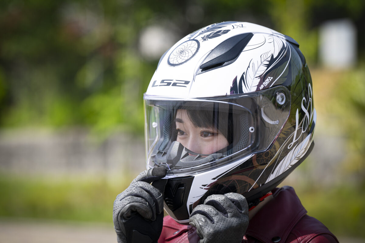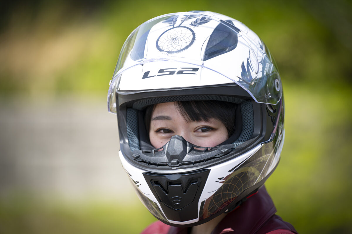 「LS2のヘルメットをはじめ、色々なヘルメットを使用してきましたが、いままでかぶったヘルメットの中でいちばん軽かったです! 1日バイクに乗っていると首が疲れてしまうことも多いのですが、LS2のRAPID Ⅱは1日乗っても首がつらくならないですね。手に持った印象よりもさらに軽い、そんな感じがしました」