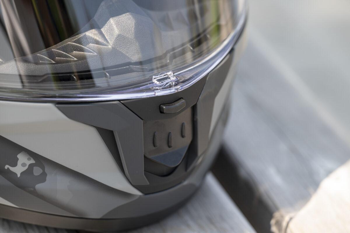 また、外側のシールドは3段階。クリック感もしっかりしており、開ける際も閉める際も硬すぎず、軽すぎず、の良い塩梅です。さらにオプションのピンロックシートを装着するマウントも装備しているので、梅雨や冬時期などにはピンロックシートを併用するとさらにクリアな視界を確保できるでしょう。写真は純正のクリアシールド。じつはこの純正シールドは94%のUVカット仕様なので、このままでも紫外線は充分にカットできます。さらに高い耐摩耗性を実現しているので傷がつきにくい仕様なのです。