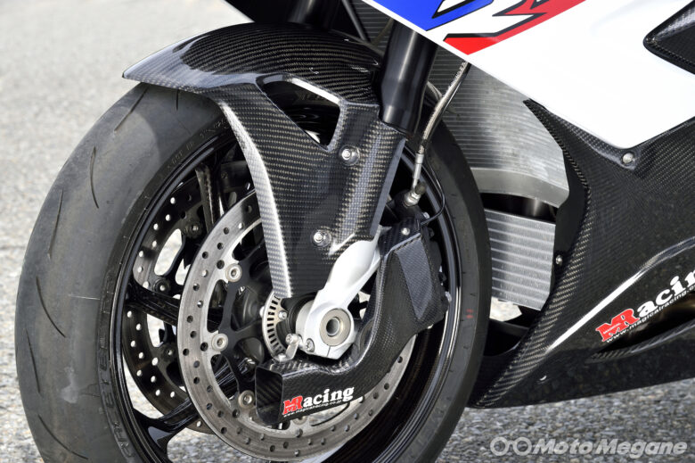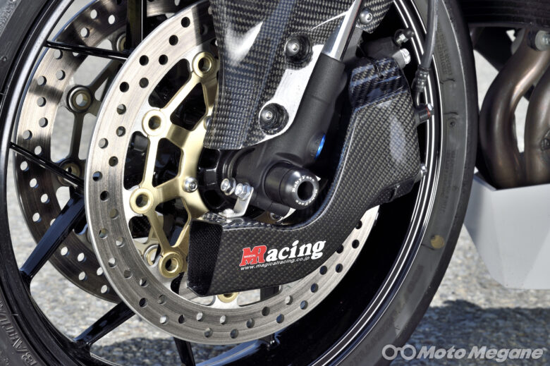冷却効果を高めるためダクト形状としたことで、フロントフォークの後ろ側にあるブレーキキャリパーにも走行風を導くことができる。サーキットにおいてハードなテスト走行を実施しその効果は実証済みだ。