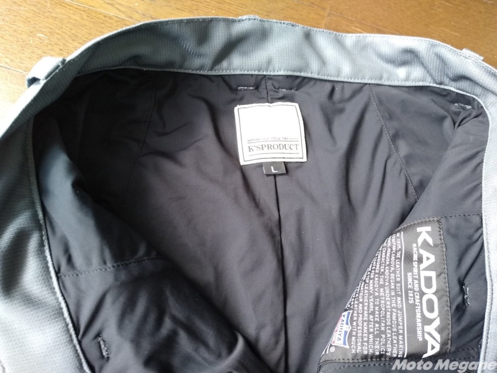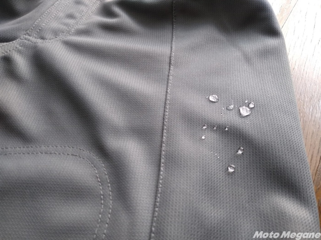 カドヤのメッシュパンツでビックリしたのは、メッシュ生地なのに撥水機能がついていること。半信半疑で水をかけてみましたが結構長時間水滴を弾いてくれるので、ちょっとした雨や霧などレインコートを着るか迷うシーンで重宝しそうです。