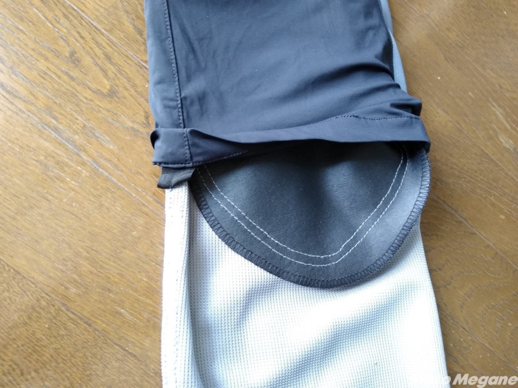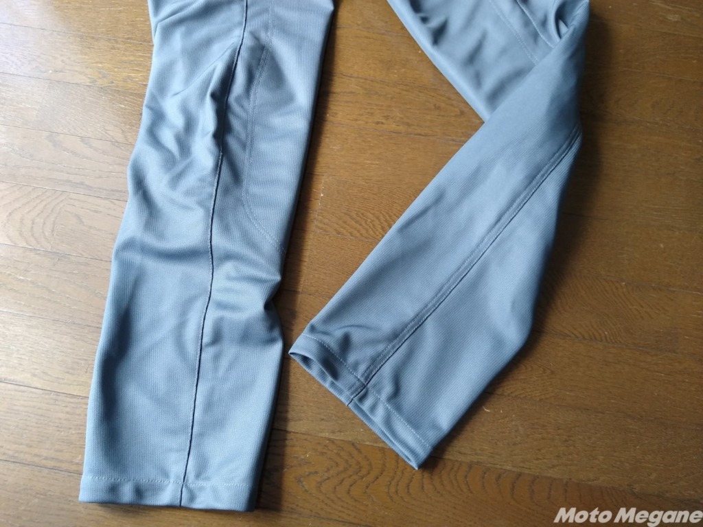 膝から上の部分は細かい裏メッシュが付いていて、引っかかりが少なく耐久性が高そうな造りです。走行風の爽快感は少ない印象ですが、肌触りはサラッとしているのでベタベタして不快な印象はありませんでした。
