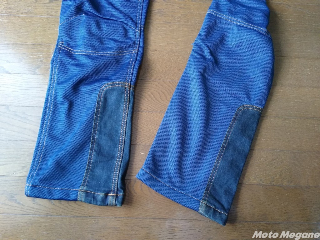 傷みやすいお尻と裾の内側は耐久性の高いデニム生地に切り替えていますが、デザイン上の違和感はありません。他の部分はフルメッシュとなっていて、通気性も良好です。