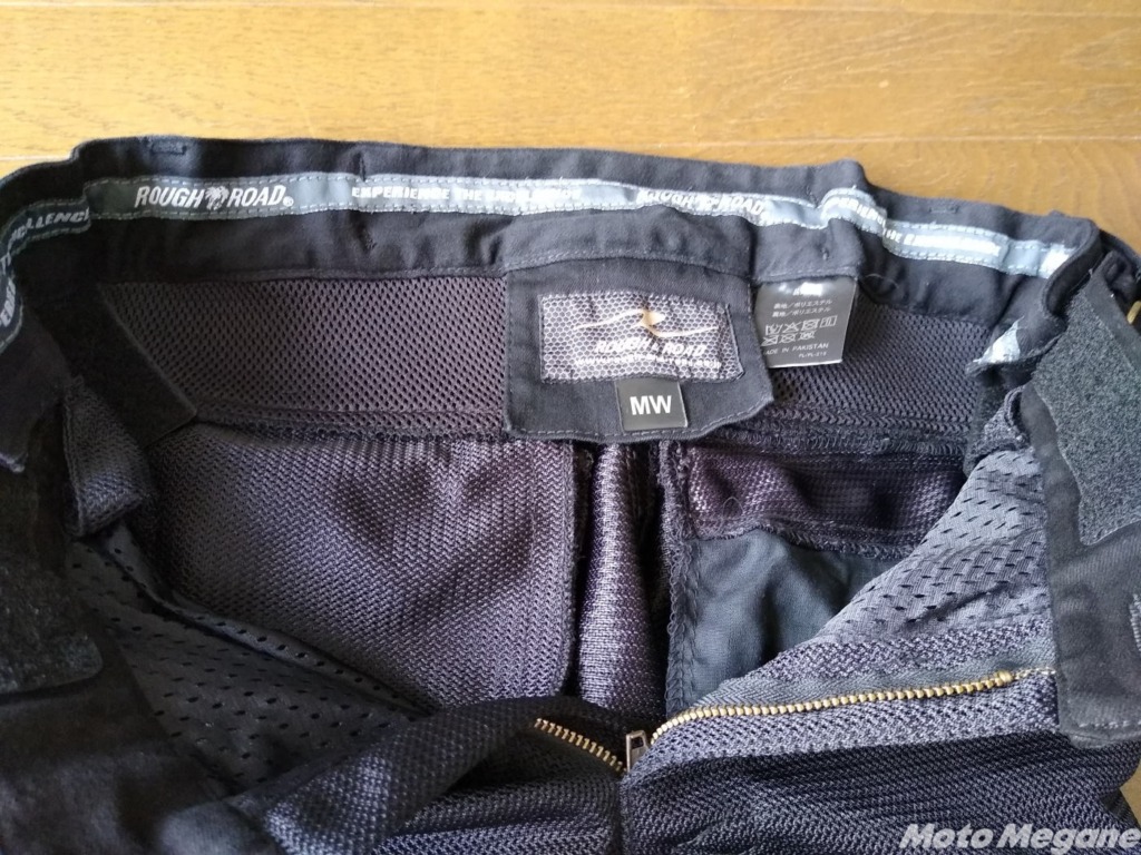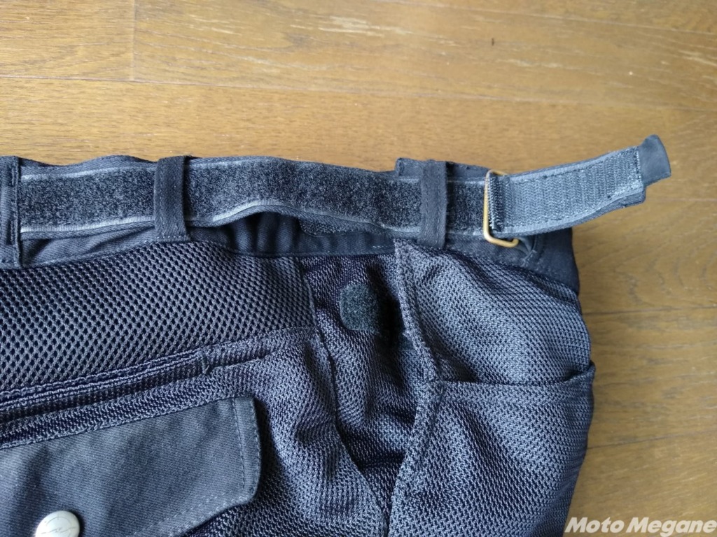 ルーズフィット構造でウエストサイズを調整できるので、ツーリング先でお腹いっぱいグルメを楽しんでも大丈夫です。左右に一つずつ付いていて、結構調整幅があります。