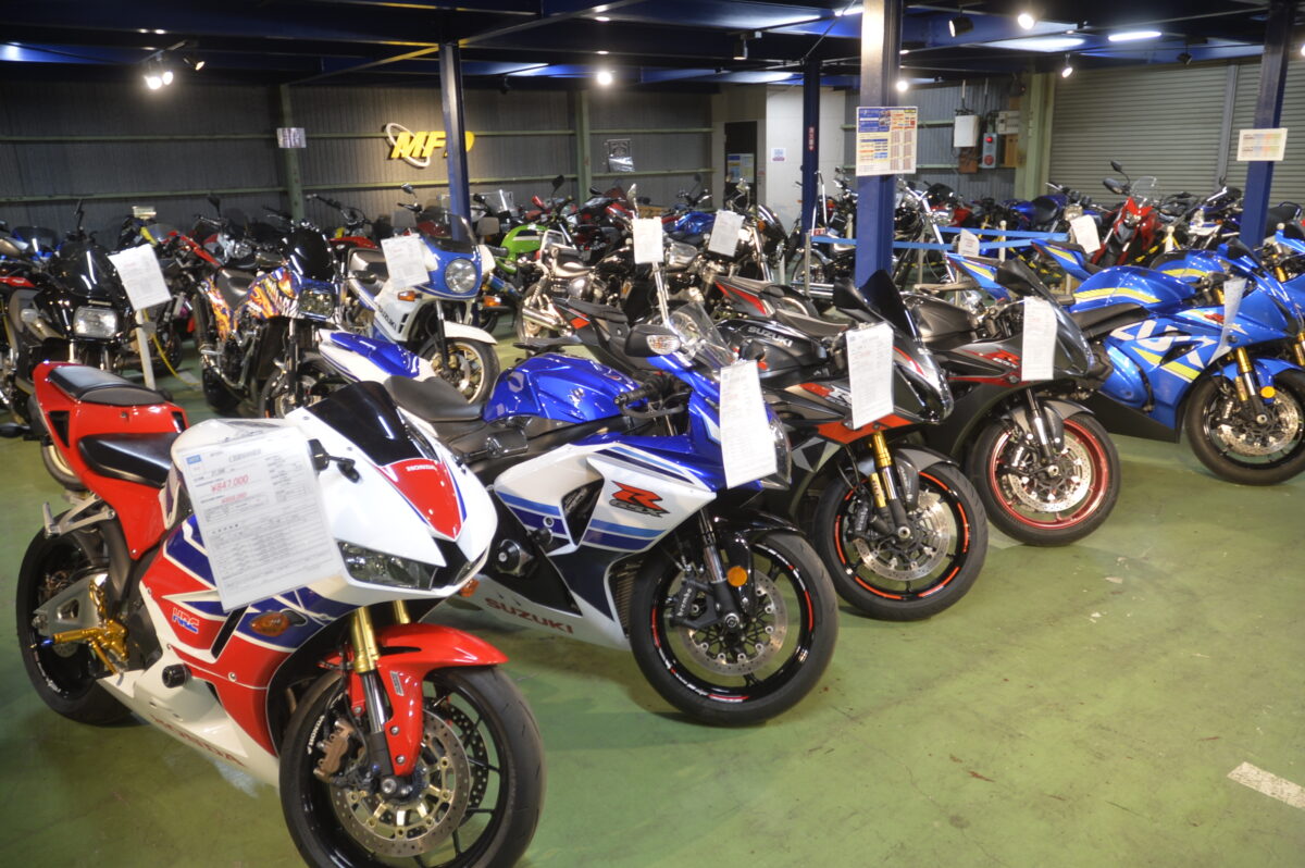 国内外の新車を取り扱い、SUZUKI中古車を多数展示販売するMFDモトフィールドドッカーズ。同グループは総数12拠点(モトフィールドドッカーズ8店舗、KTM専門4店舗)で関東から沖縄まで広く店舗展開している。