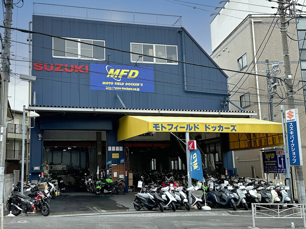 横浜にあるバイクショップ<モトフィールドドッカーズ(以下MFD)横浜>は、新車から中古まで在庫が豊富なバイクショップ。しかもただバイクを売るだけじゃない。整備や車検のほか、洗車サービスなども行っている。くつろげる休憩室もあるので、ツーリング帰りにも立ち寄りたくなるショップなのだ。