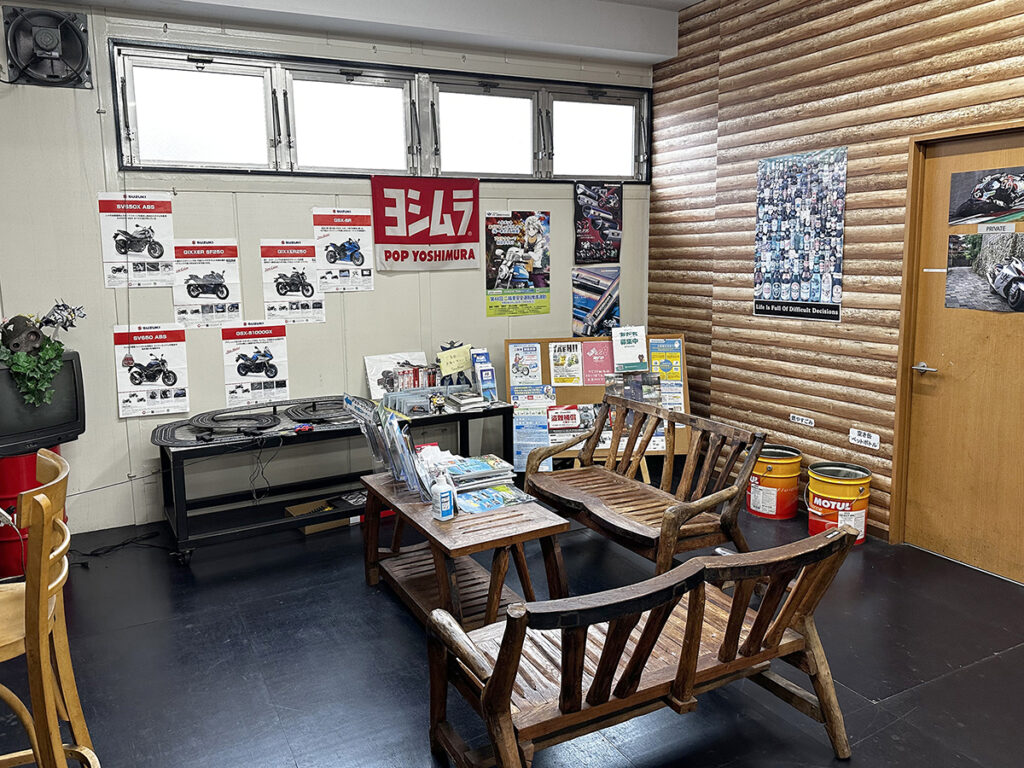 有名ライダーのサインが入ったヘルメットやアイテム、あちこちに置かれたフィギュア、スロットレーシングなど遊び心に満ちた空間は居心地が良いので、悠斗さんはツーリング帰りなどに立ち寄ることもあるんだとか。