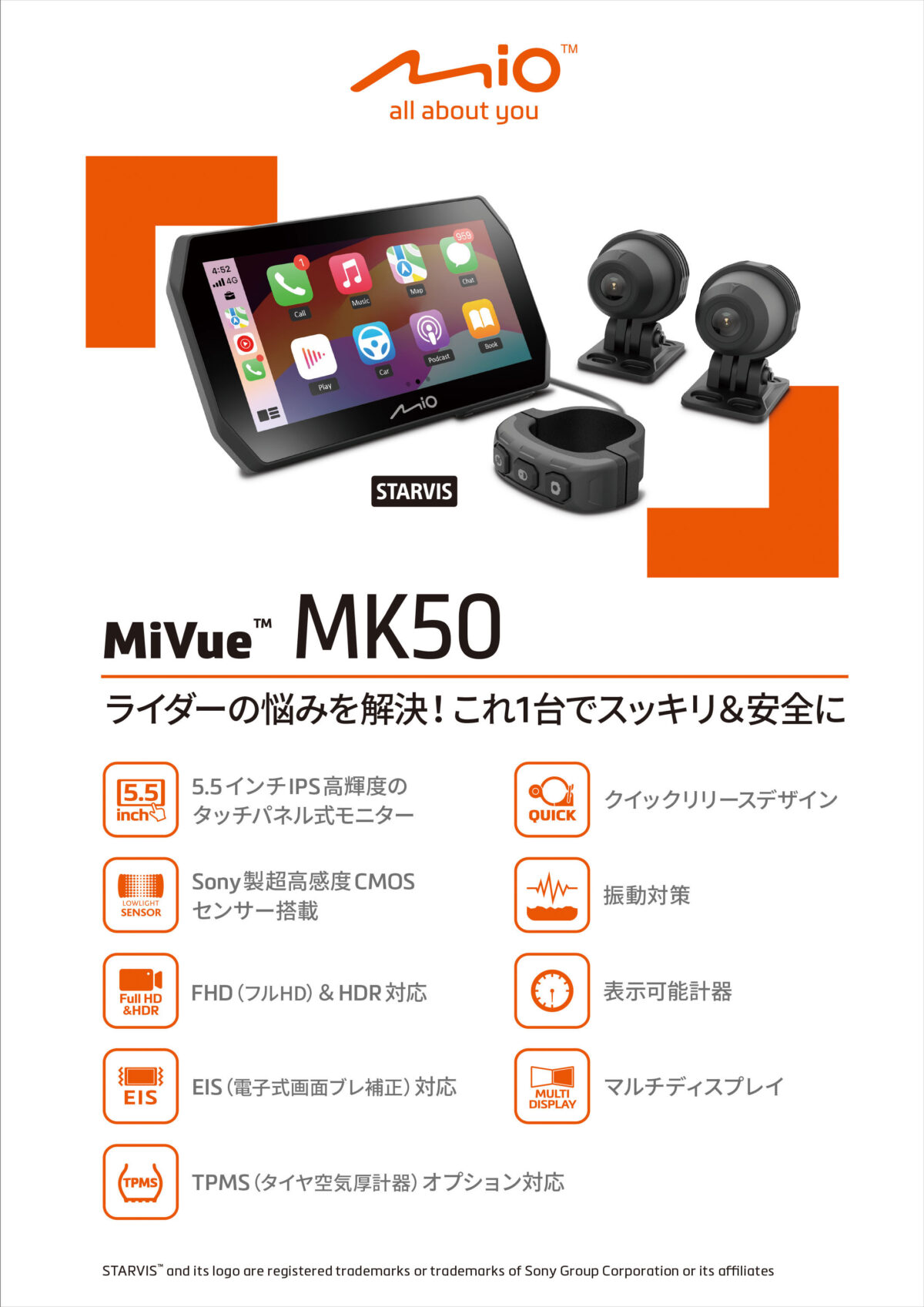 2025年のMio MiVueシリーズ新製品『MK50』は、なんと5.5インチのスマートモニターを装備する2輪用ドライブレコーダー。モニター部分は、時計速度計といったダッシュボード画面はもちろんのこと、走行中の前後ドライブレコーダーの映像を表示可能。またアンドロイドオート(Android)、アップルカープレイ(iPhone)などのスマートフォンアプリのミラーリングにも対応しており、ナビゲーション画面表示といった使い方ができる。ちなみにモニターに表示できる機能はアンドロイドオート、アップルカープレイに準拠する。