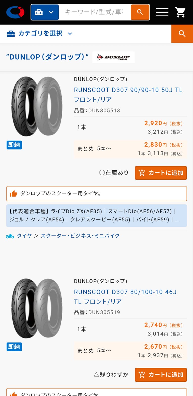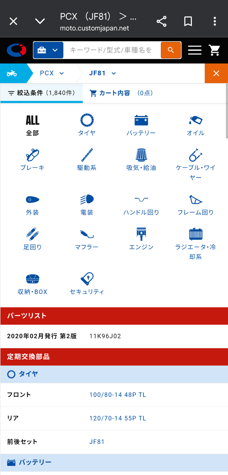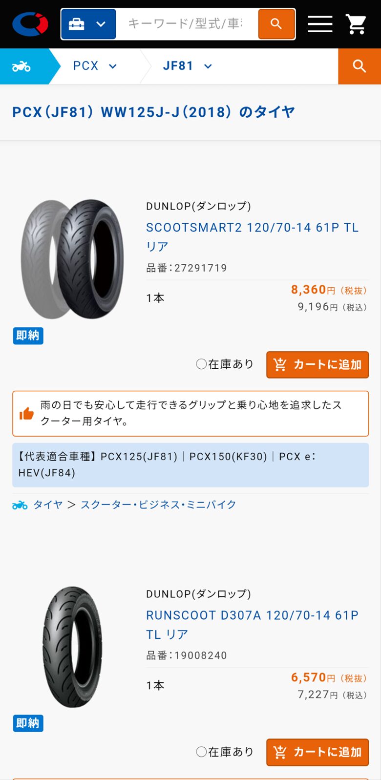 すると「タイヤ」「駆動系」「足回り」といった具合にカテゴリを整理した状態で表示されるので、今回はタイヤを選択。あっという間に2018年式PCX(JF81)への適合タイヤへと辿り着くことができた。