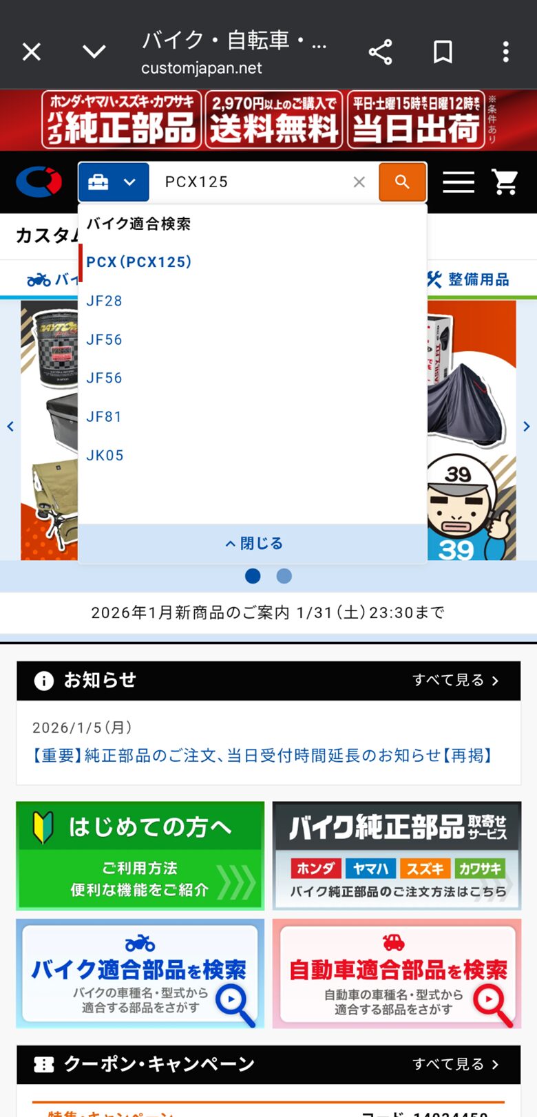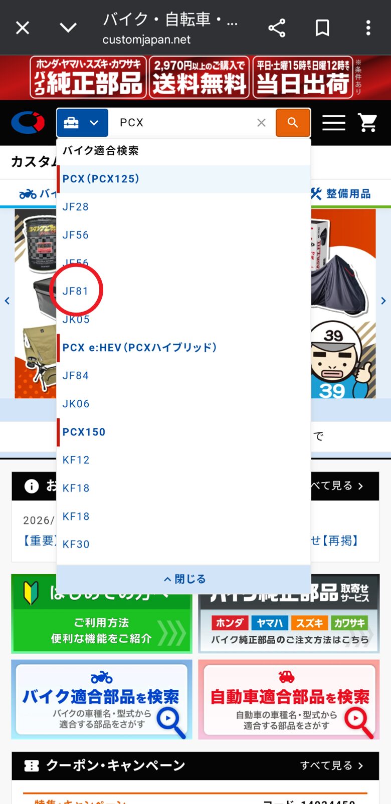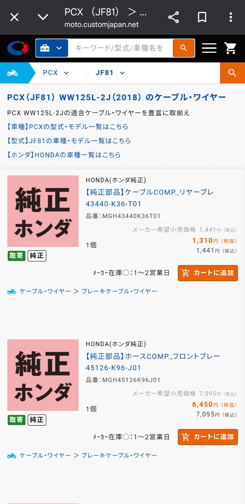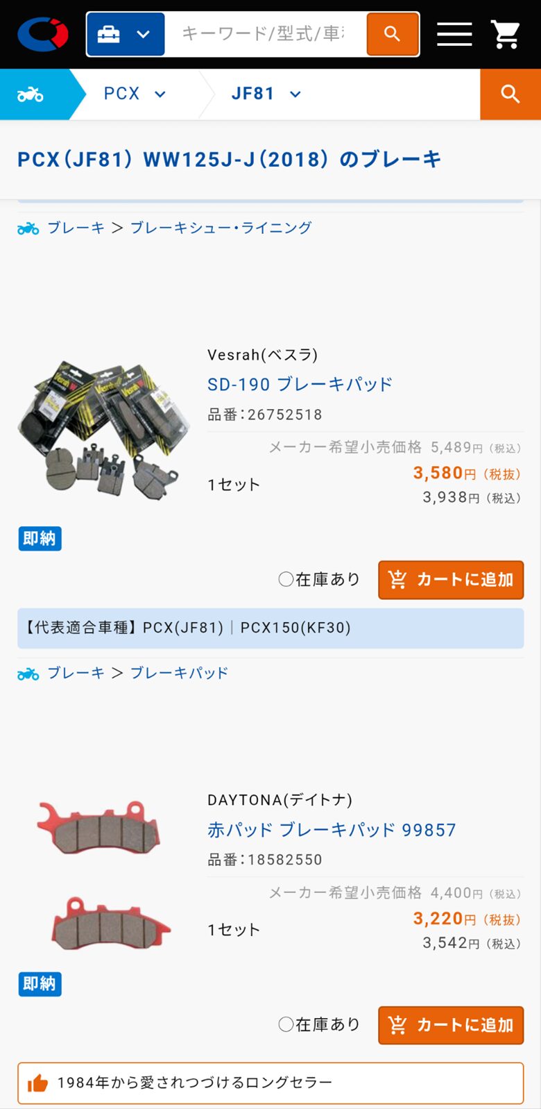 実際に、筆者の現行カタログから落ちて久しい愛車の2018年式PCX(JF81)の消耗品を探してみた。
