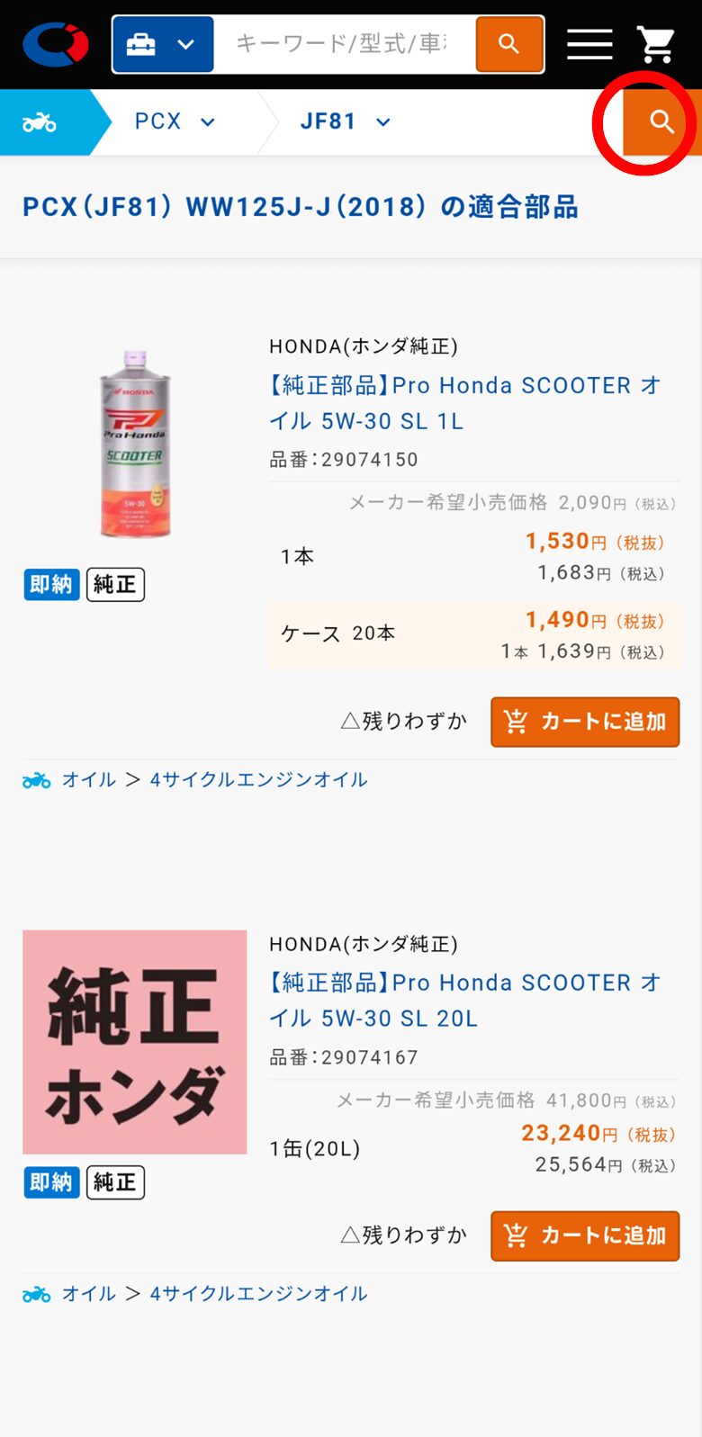 ログイン後に検索窓に車種名を入力して検索。ここまでは普通のサイトと同じなのだが、ここから先述にもあるように年式ごとの形式番号を選択した後、さらに赤丸の「🔍」マークをタップ。
