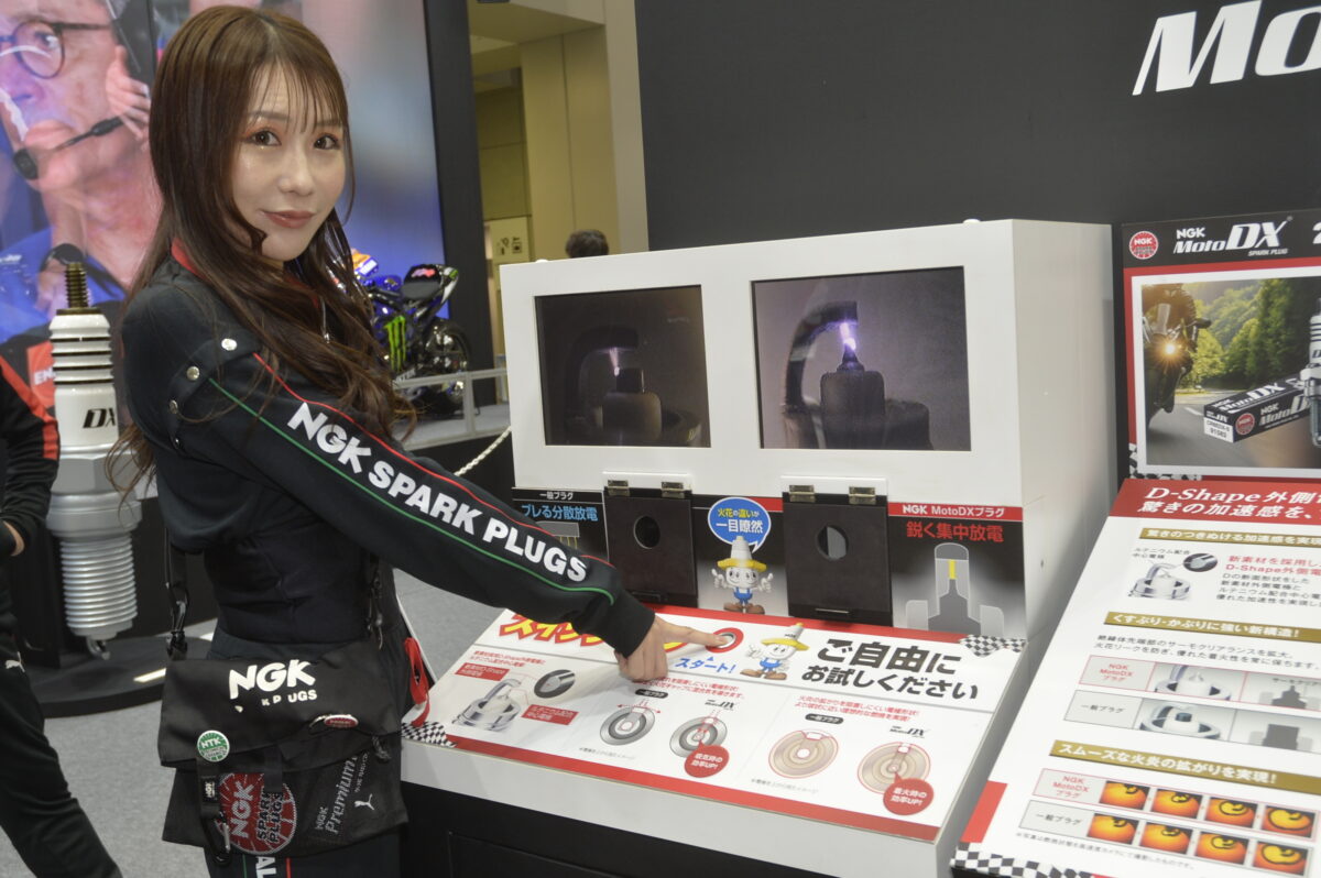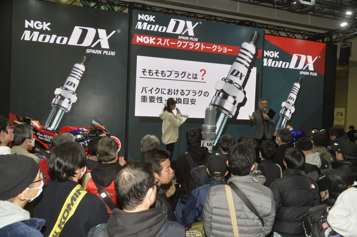 押しの商品はもちろん、初の二輪専用スパークプラグである「NGK Moto DX スパークプラグ」。これまでのスパークプラグとは一線を画す技術を体感できるコーナーを設置するほか、プロライダー・宮城光氏がトークショーで、スパークプラグの重要性と、NGK Moto DX スパークプラグの革新技術の凄さを来場者にアピールした。