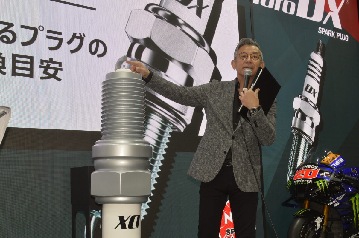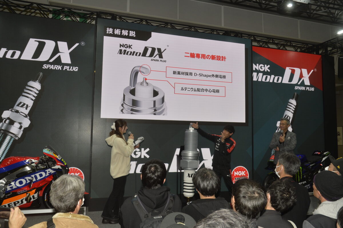 東京モーターサイクルショーが開催された土曜、日曜に、プロライダーの宮城光氏が、NGKブースの特設ステージに登壇してトークショーを開催。内燃機関におけるスパークプラグの重要性を、自身の幅広い経験から来場者に語りかけた。また、トークショー後半にはNGKスタッフとともに、初の二輪車専用プラグ「NGK Moto DX スパークプラグ」の革新技術の解説や、そのメリットについて語った。
