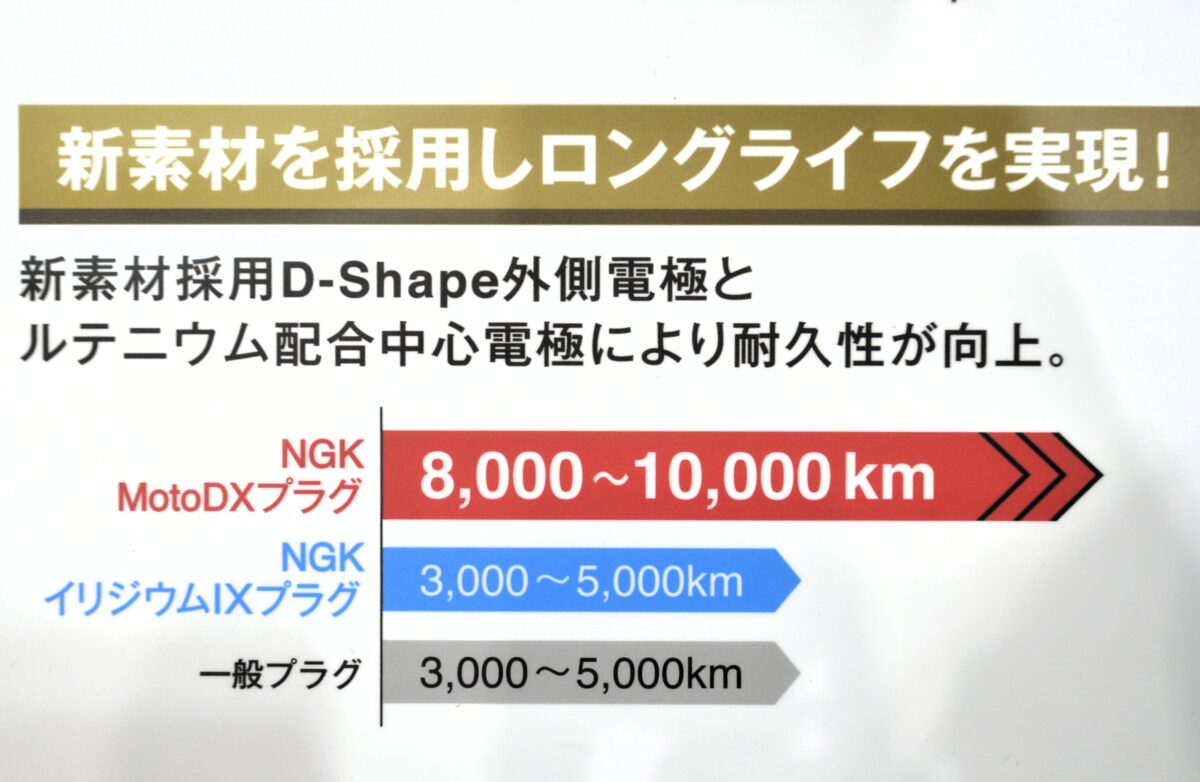 『一般的なプラグやイリジウムプラグの交換推奨サイクルは3000km~5000kmですが、NGK Moto DX スパークプラグの交換推奨サイクルは8000km~1万kmです。