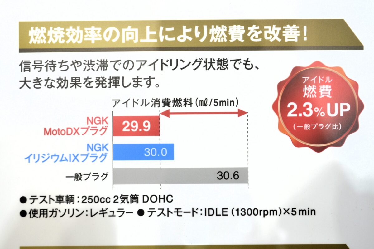信号待ちや渋滞でのアイドリング状態でも、NGK Moto DX スパークプラグは効果を発揮。アイドル燃費テストでも、一般プラグに比べ2.3%ガソリン消費量が少なくなる。