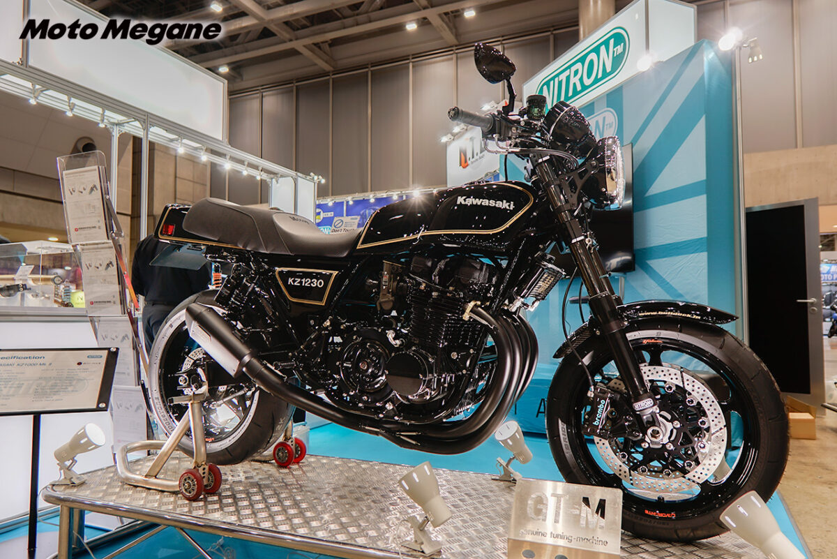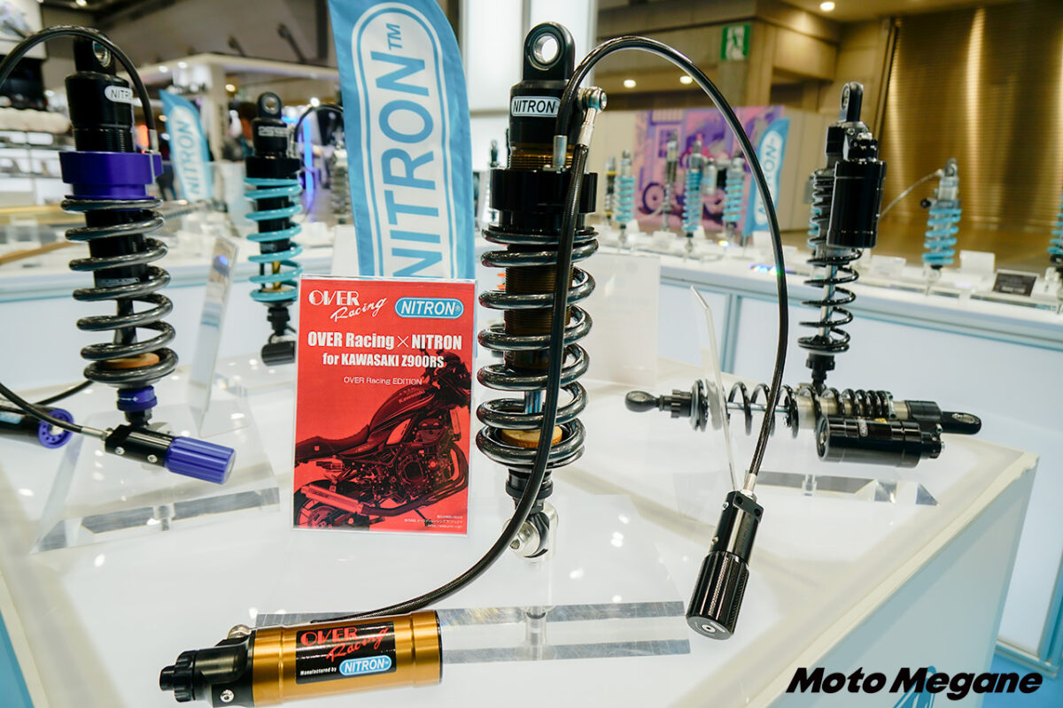 ナイトロンブースではコラボしたブランドが手がけたカスタム車輌2台とともに幅広いラインナップを持つNITRONの定番モデルが多数展示され、ブース内は鮮やかなターコイズカラーとシックで重厚感のあるブラックカラーに彩られていた。